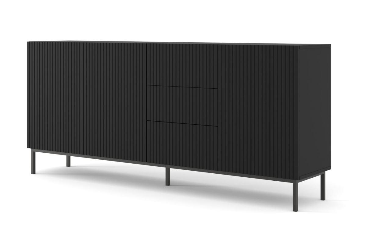 Komoda z czarnym frezowanym frontem 200 cm, na czarnej ramie do salonu Ravenna B 3D3S 2 to funkcjonalny i estetyczny wybór, który sprawdzi się w różnych wnętrzach. Wyróżnia się solidnym wykonaniem i ponadczasowym charakterem. Będzie idealnym dodatkiem do Twojej przestrzeni.
