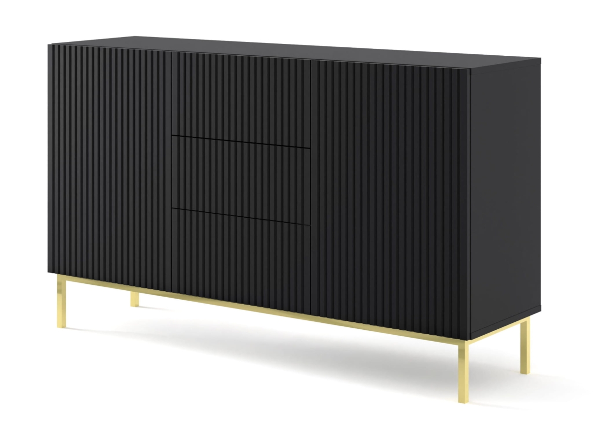Komoda z frezowanym frontem czarna matowa, 150 cm do salonu na złotej ramie Ravenna B 2D3S