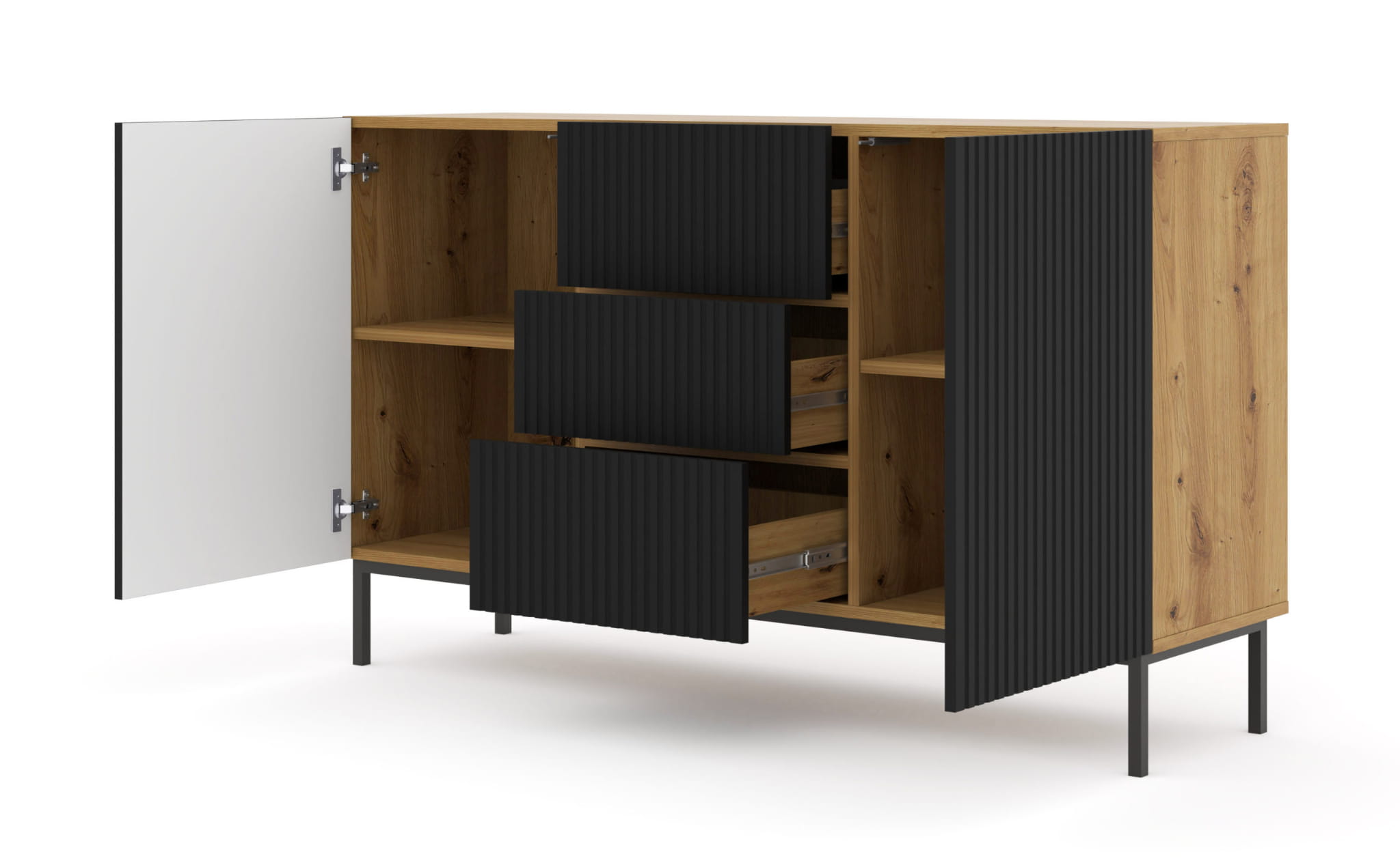 Komoda z frezowanym frontem czarna/dąb artisan, 150 cm do salonu na czarnej ramie Ravenna B 2D3S
