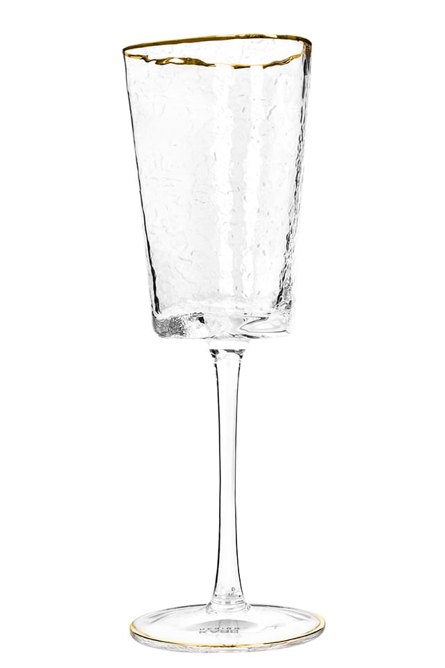 Elegancki komplet kieliszków do wina HOMMAGE od KARE to wyjątkowe połączenie nowoczesnego designu i ręcznego wykonania. Każdy kieliszek został w całości wykonany ze szkła i ozdobiony subtelnymi, złotymi akcentami, które dodają mu luksusowego charakteru.