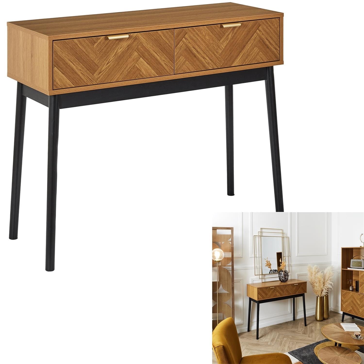 Wyposażona w dwie szuflady z frontami w jodełkę oraz złote, metalowe uchwyty, stanowi efektowny akcent do salonu, sypialni czy przedpokoju.
