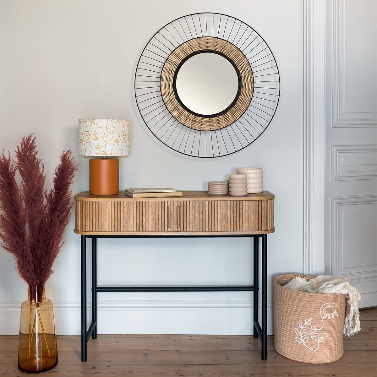 Dodaj autentyczny, praktyczny mebel do swojego wnętrza! Dwudrzwiowa konsola Colva została zaprojektowana, aby ułatwić Ci życie. Drewniana konsola Colva będzie wyglądać świetnie w przedpokoju, korytarzu lub salonie. Pod blatem znajduje się mnóstwo miejsca na klucze, dokumenty lub portfel. Blat stanowi dekoracyjną powierzchnię, na której można umieścić wazon, zdjęcia lub inne akcesoria dekoracyjne. Konsola Colva to skandynawski stolik o metalowej podstawie. Jego konstrukcja, blat, drzwi i półka są wykonane z włókna drzewnego, a okleina dębowa, co zapewnia stonowany, nowoczesny wygląd. Materiał produktu: MDF, płyta pilśniowa Materiał nogi (nóg): metal Materiał konstrukcji: MDF - Płyta pilśniowa, Płyta wiórowa powlekana Waga: 15,8 kg Samodzielny montaż: Tak Materiał okleiny: Papier (efekt dębu)