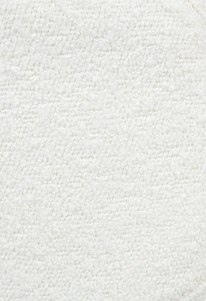 Oparcie i siedzisko tapicerowane są przyjemną, miękką w dotyku tkaniną boucle w kolorze białym.