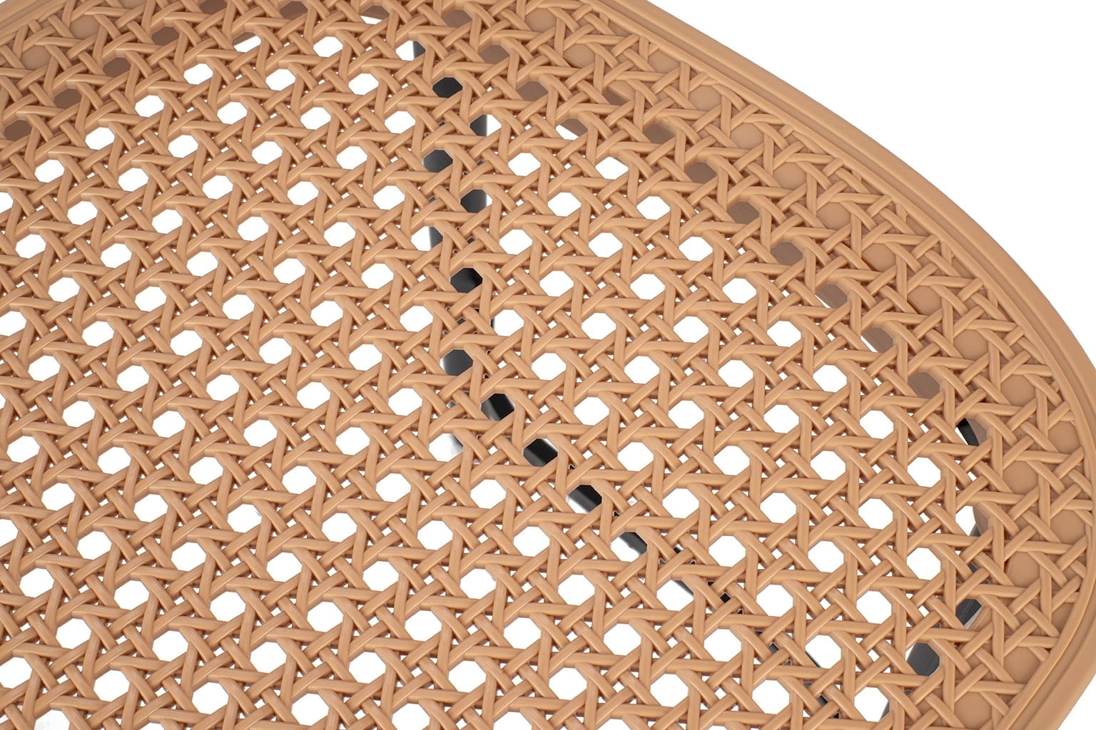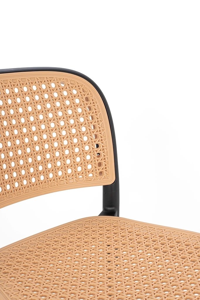 Ażurowe siedzisko i oparcie, stylizowane na rattan, nadają hokerowi lekkości i świeżości.