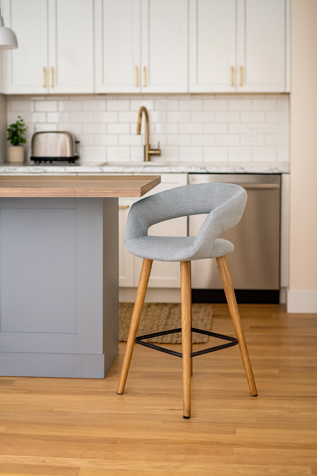 Stołek barowy Grace to eleganckie i funkcjonalne rozwiązanie do otwartych kuchni oraz jadalni z wyspą. Jego siedzisko zostało obite wysokiej jakości tkaniną w kolorze jasnej szarości, zapewniając komfort i stylowy wygląd.