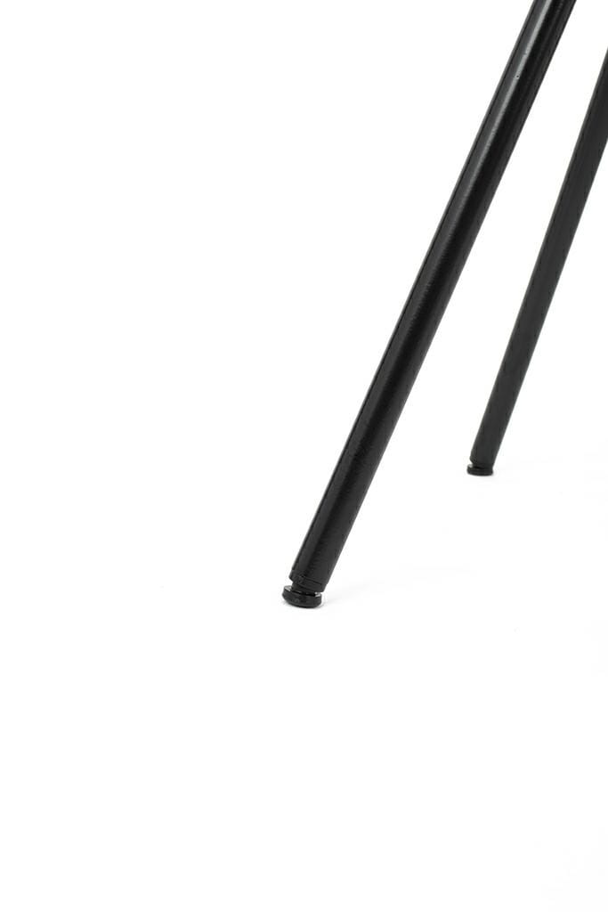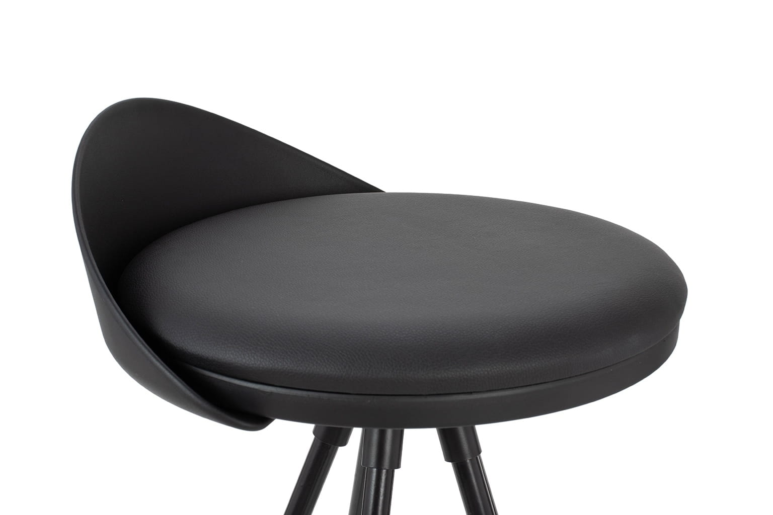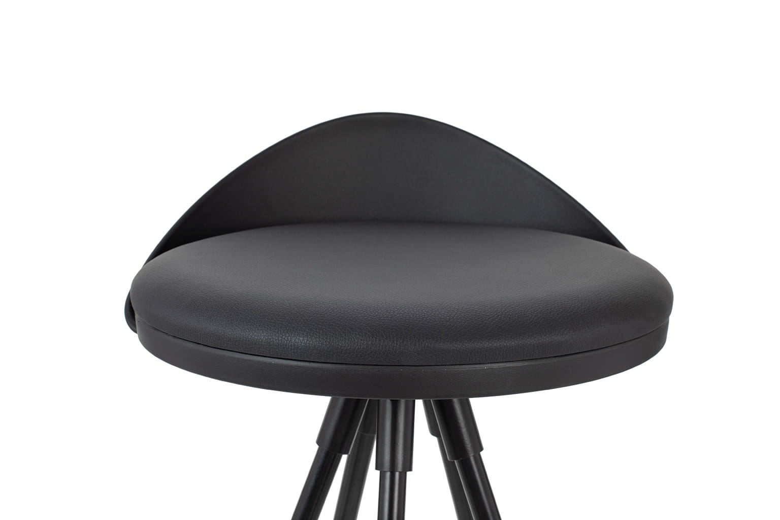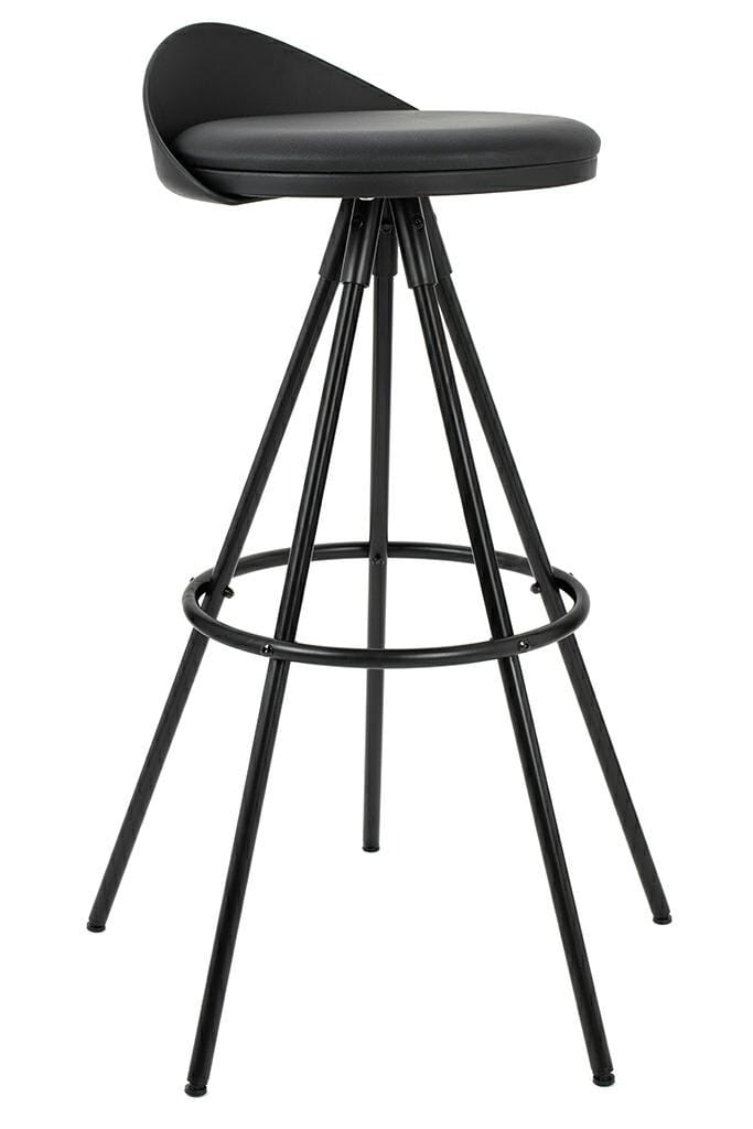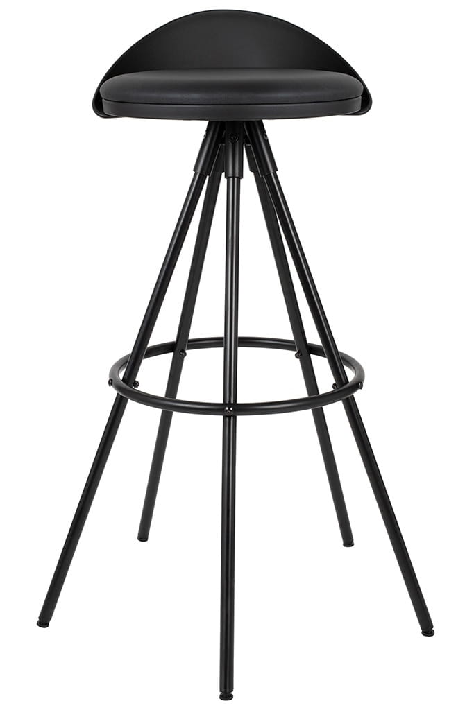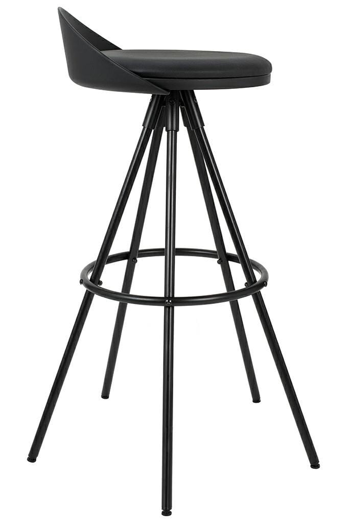 Niskie oparcie oraz wygodne siedzisko z poduszką z ekoskóry zapewniają komfort, a smukłe, metalowe nogi w kolorze czarnym nadają mu lekkości.