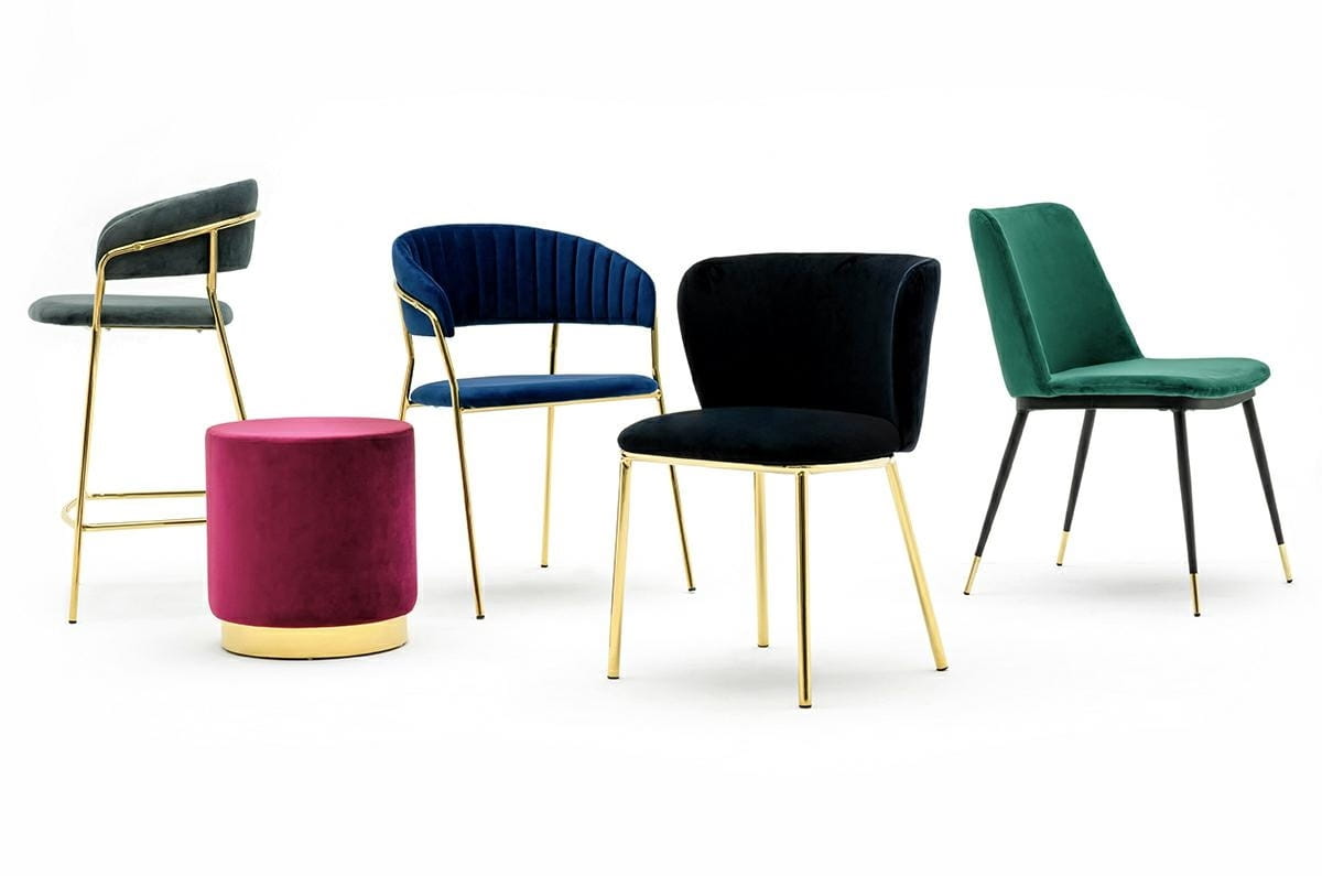 Daj się oczarować połączeniu modnej tkaniny welurowej z efektownym złotem.