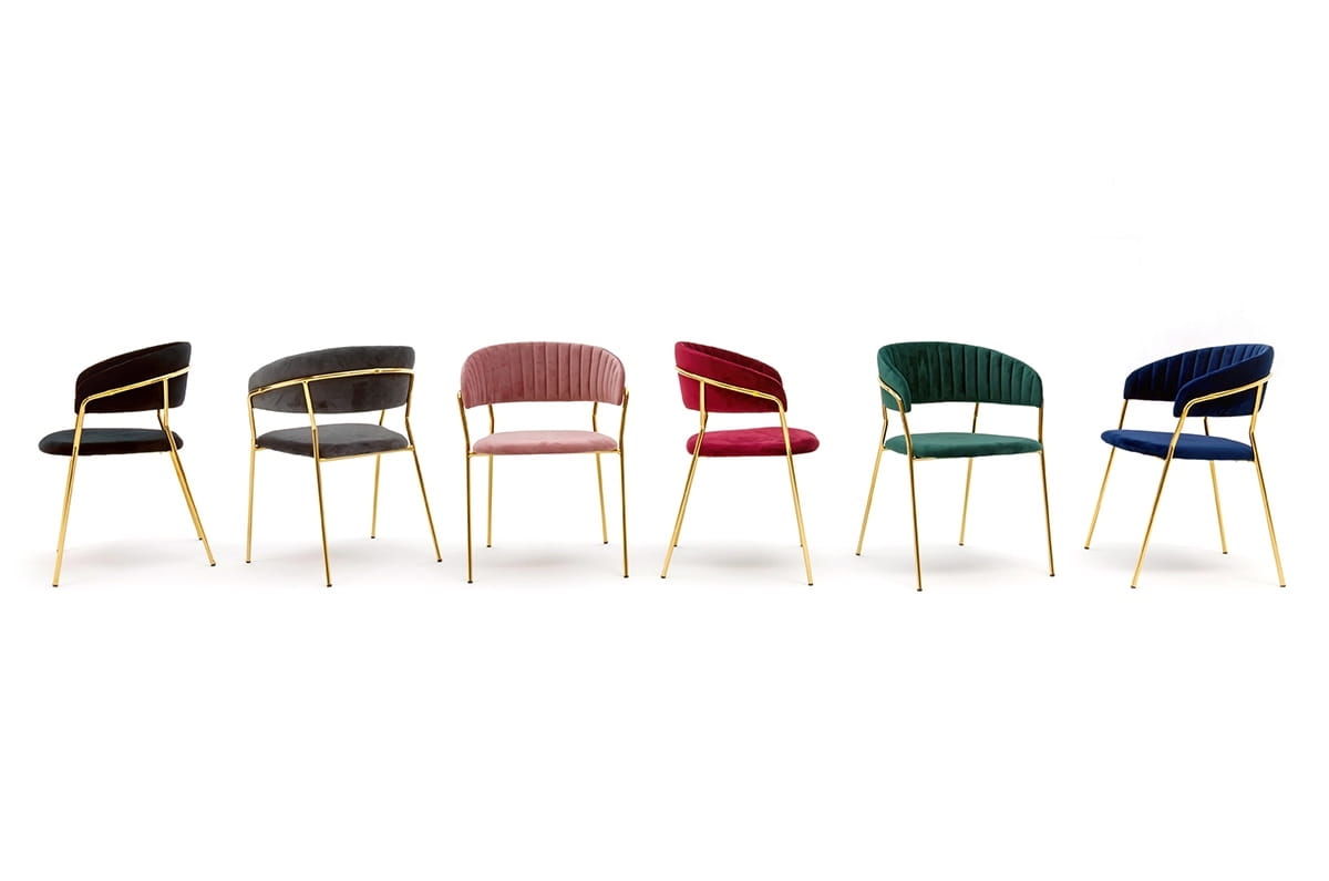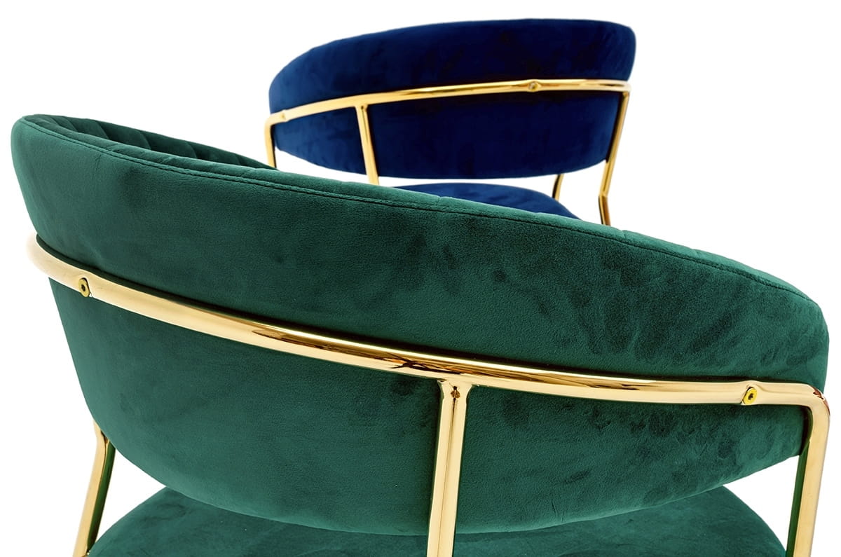 Elegancki design: Welurowe tapicerowanie, złota metalowa konstrukcja, pionowe przeszycia na oparciu.