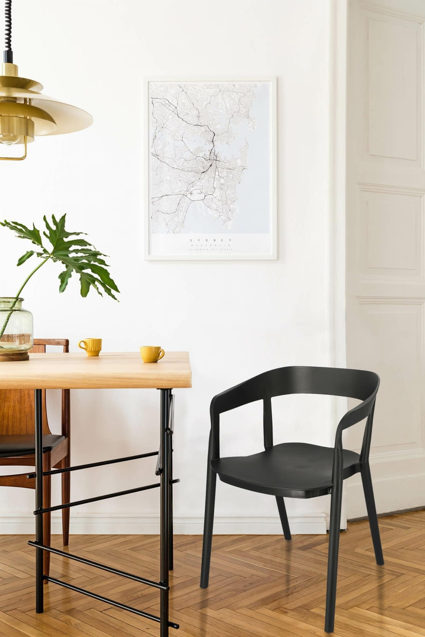 Oparcie krzesła delikatnie przechodzi w podłokietniki tworząc przy tym wytrzymałą konstrukcję.