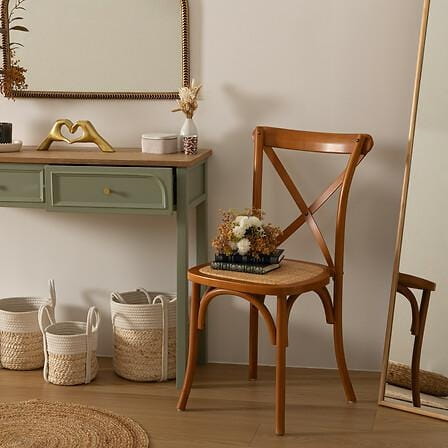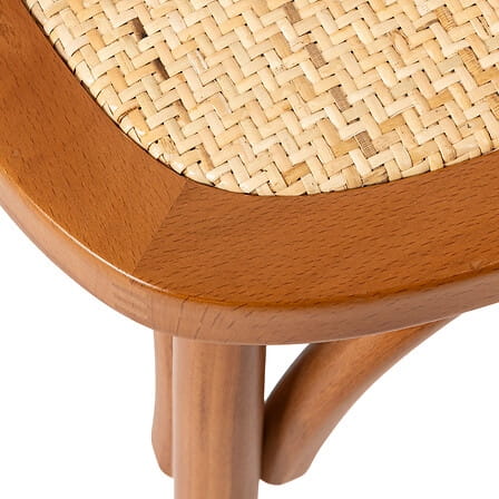 Stelaż i nogi wykonane zostały z solidnego drewna bukowego, a miękkie siedzisko z pianki poliuretanowej ozdobiono plecionką z naturalnego rattanu, która dodaje uroku i lekkości. Krzesło nie wymaga montażu i jest sztaplowane, co ułatwia jego przechowywanie i przenoszenie.