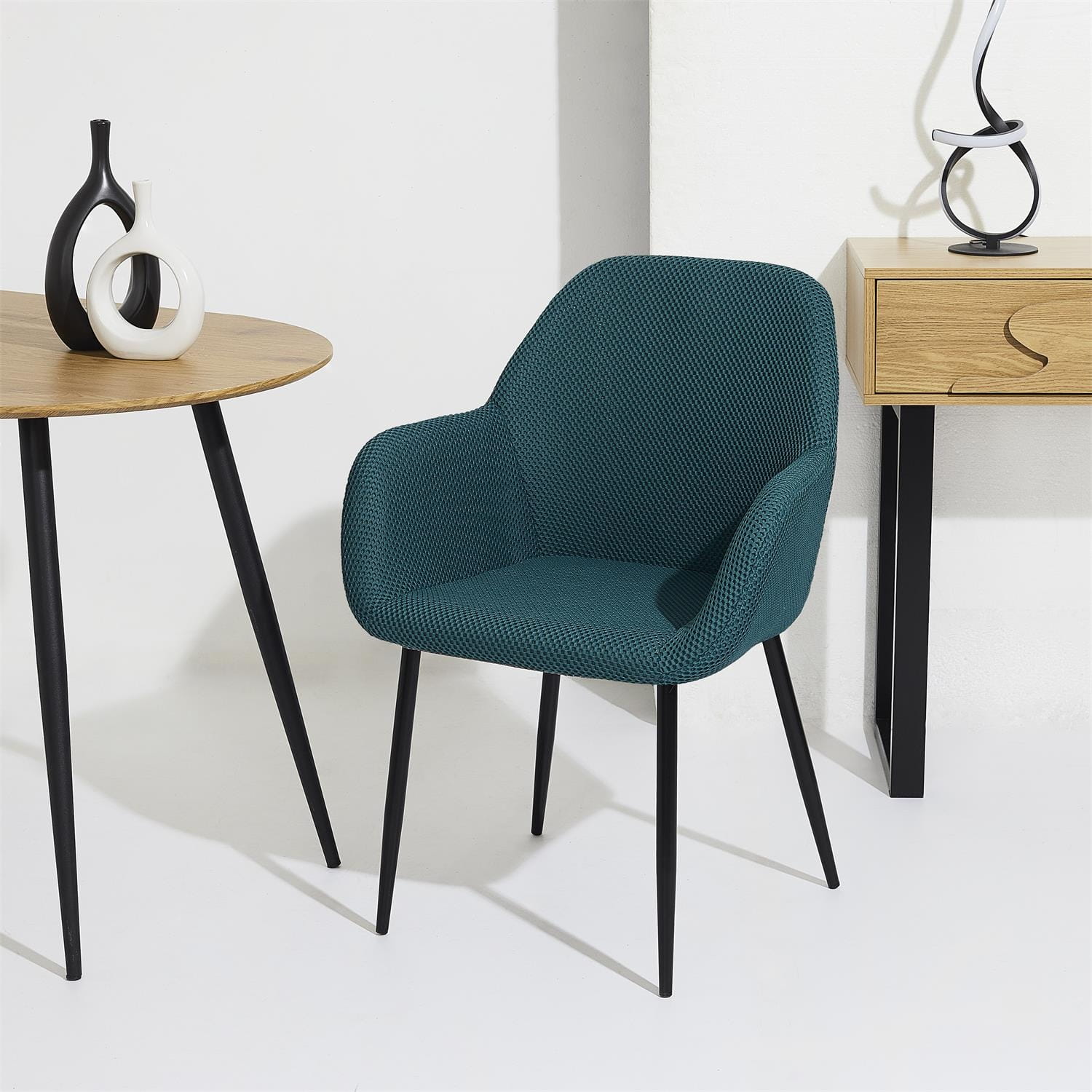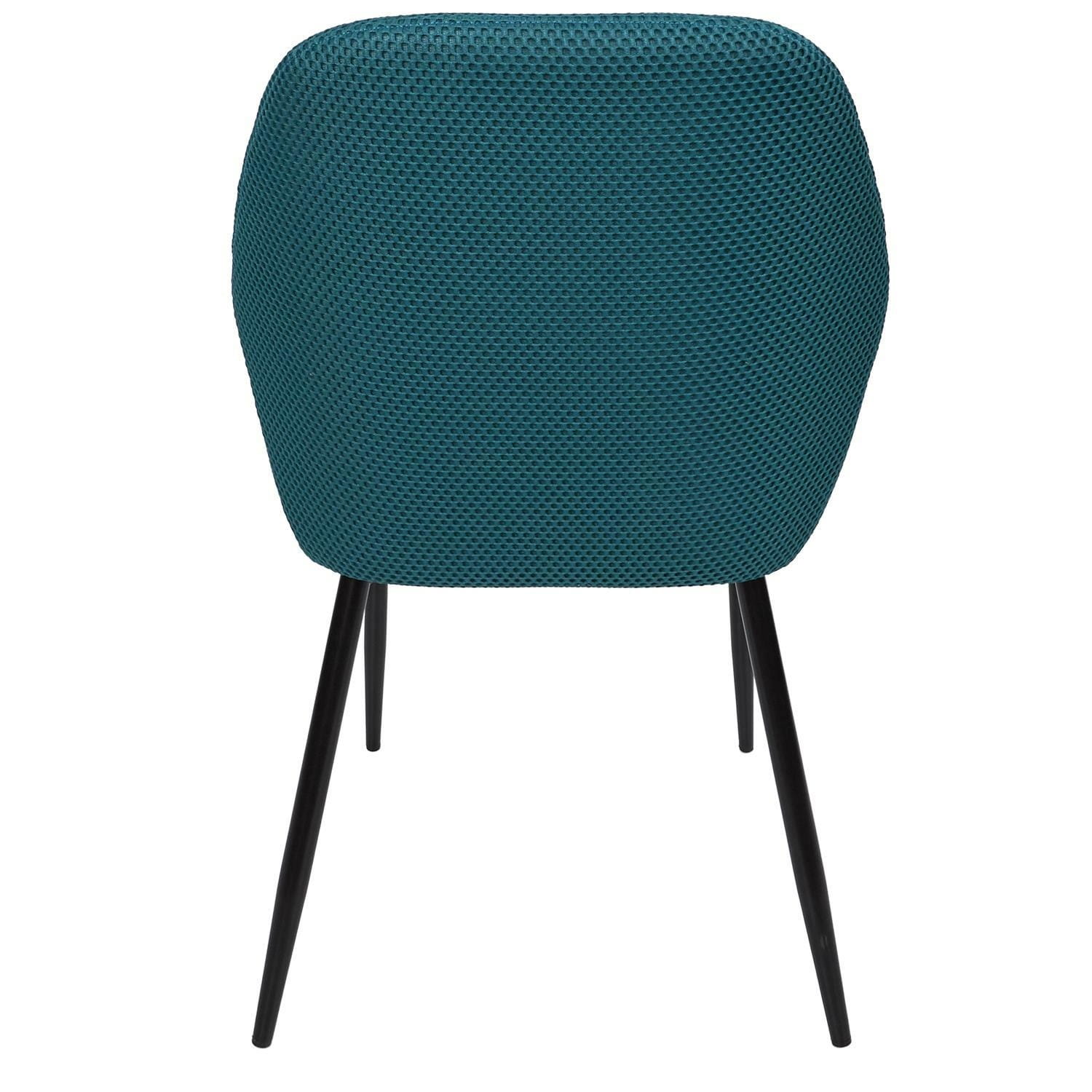 Tkanina dystansowa daje efekt 3D, dobrze przepuszcza powietrze i minimalnie chłonie wilgoć, dlatego krzesło sprawdzi się także w kuchni i jadalni.