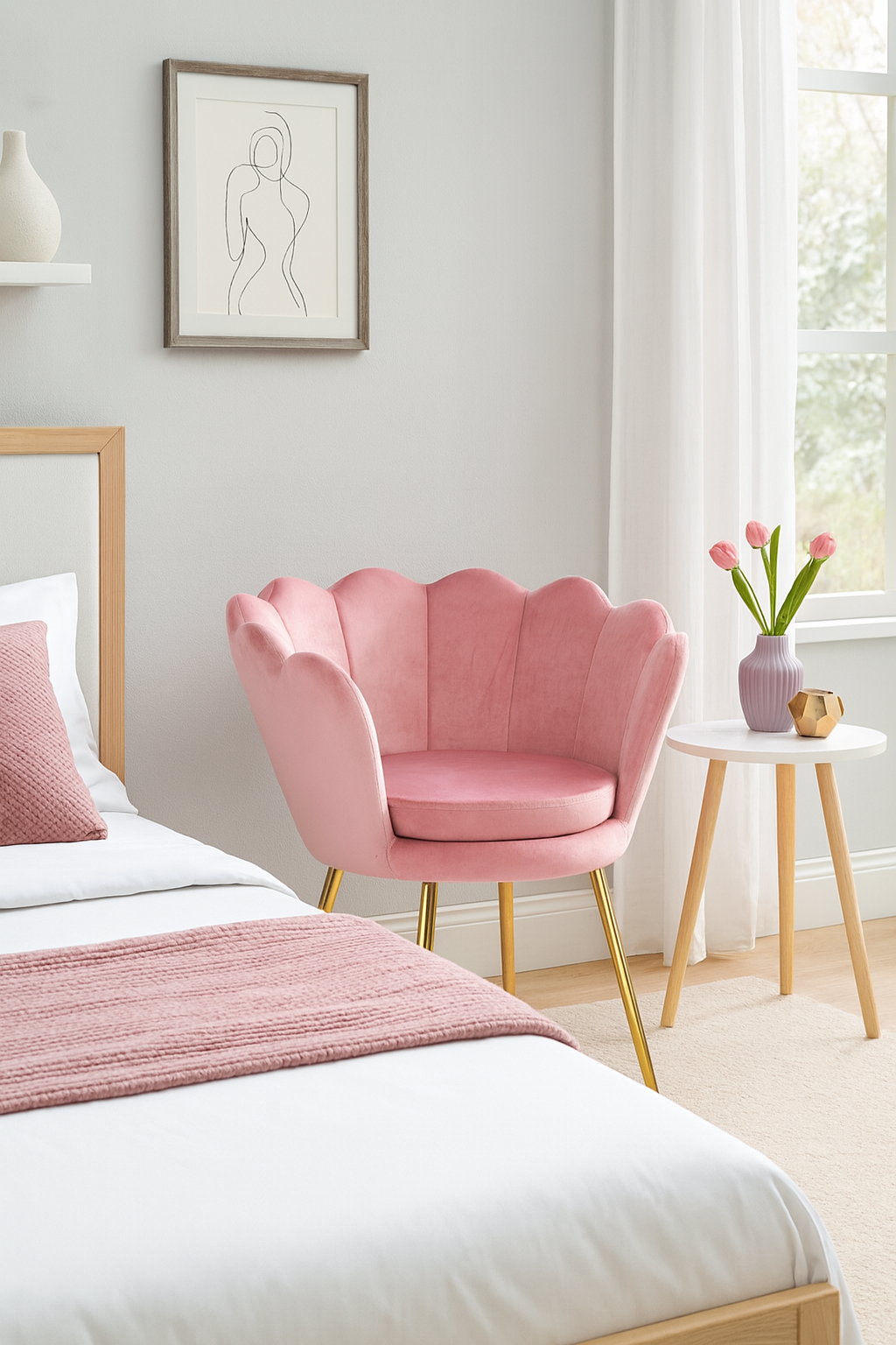 Charakterystyczne oparcie w kształcie muszli nadaje wnętrzu lekkości i stylu glamour, a miękka tapicerka velvet przyjemnie otula podczas siedzenia.