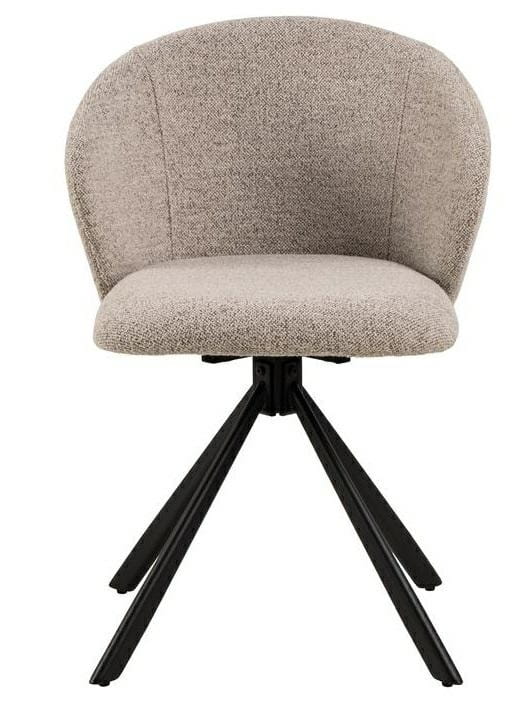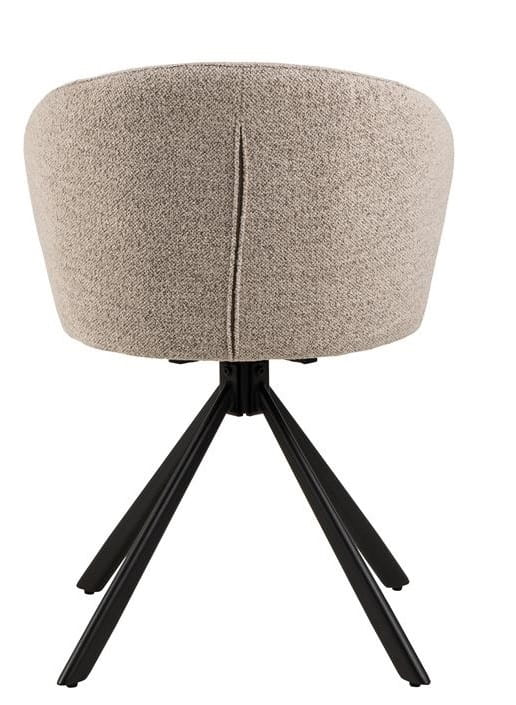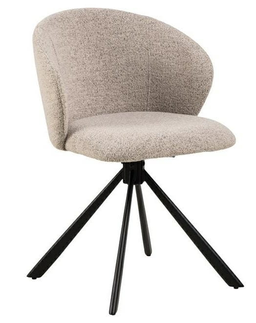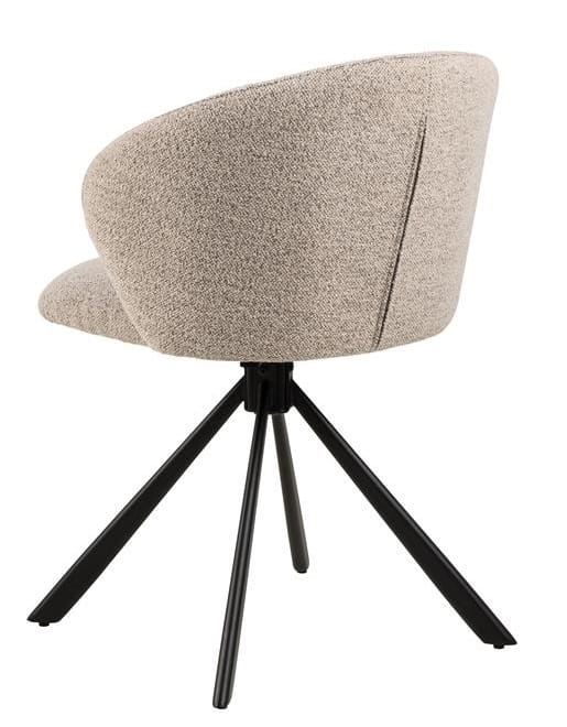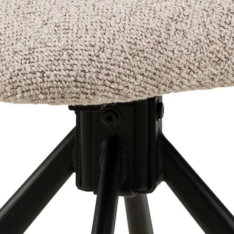 Oryginalnie wyprofilowane siedzisko pokryte jest beżową tkaniną bouclé o kręconej strukturze, która przyciąga wzrok i zachwyca miękkością.
