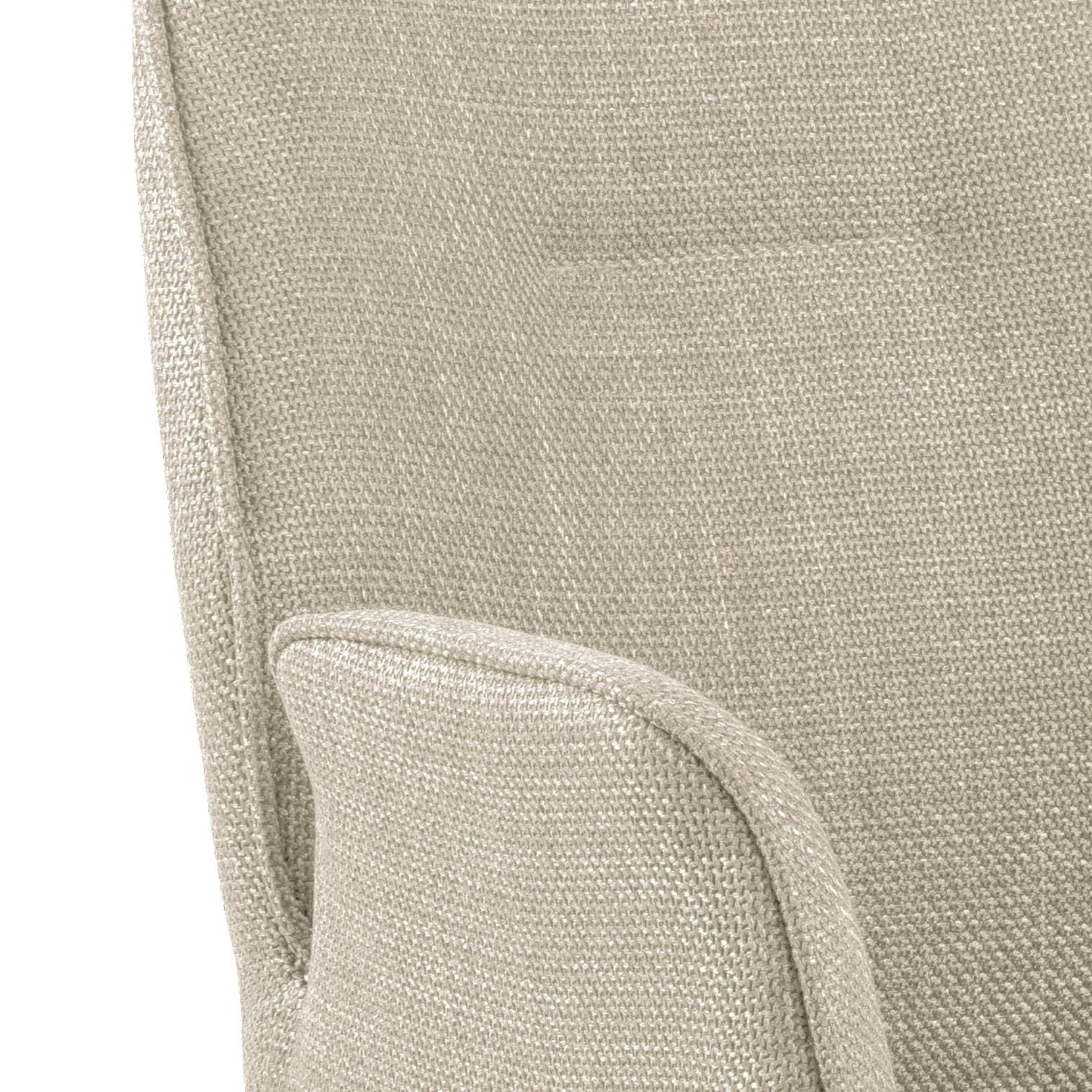 Charakterystyczna sylwetka, wyraziste detale z lamówki oraz beżowa tkanina o subtelnym dwutonowym efekcie sprawiają, że mebel przyciąga wzrok i doskonale wpisuje się w modne aranżacje wnętrz.