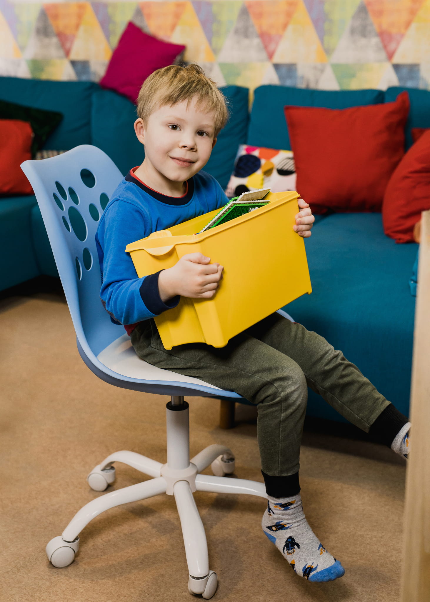 Model wyposażono w regulowany siłownik, który umożliwia dopasowanie wysokości do potrzeb dziecka. Pięcioramienna podstawa z kółkami gwarantuje stabilność i chroni podłogę przed zarysowaniami. To idealne krzesło do biurka w pokoju ucznia.