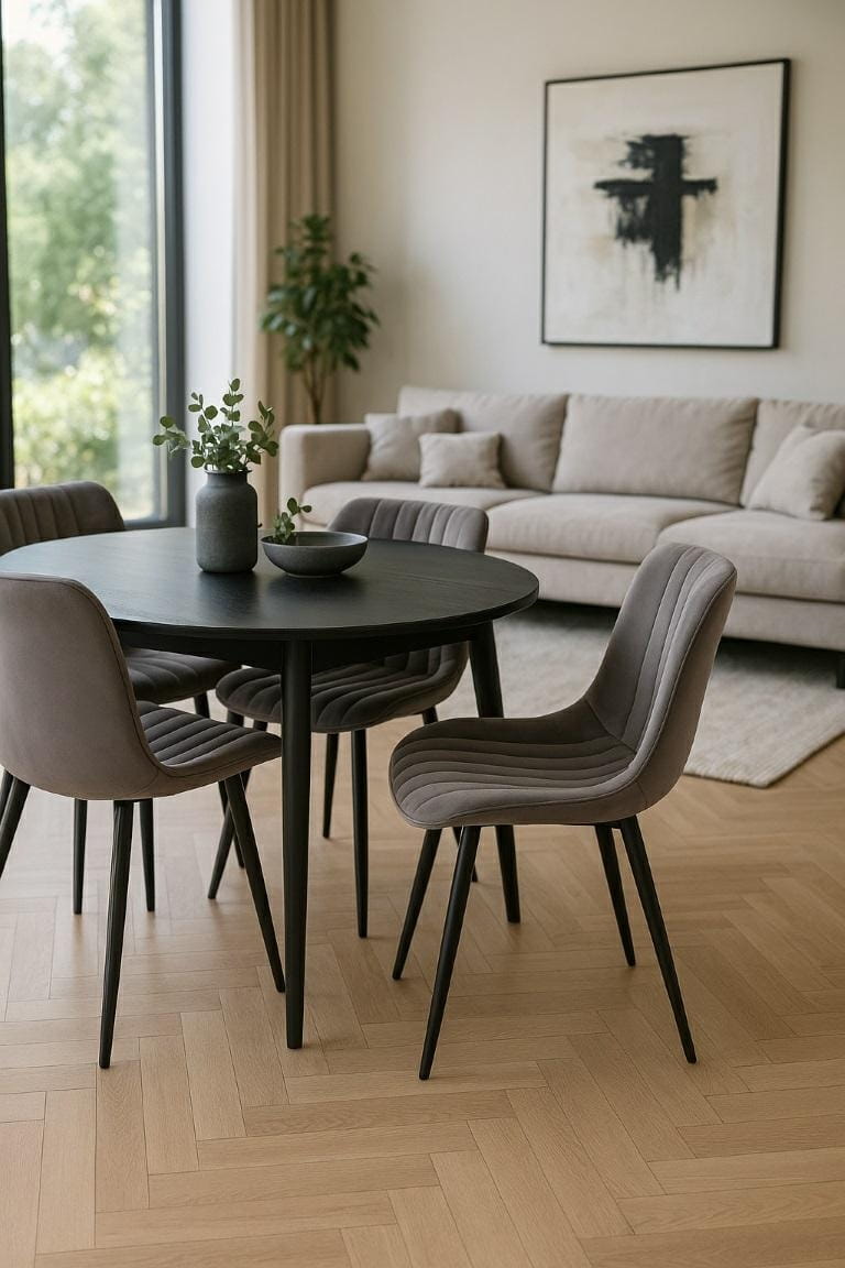 Krzesło Roxino to eleganckie i funkcjonalne rozwiązanie, które świetnie sprawdzi się w jadalni, salonie czy biurze. Siedzisko tapicerowane miękkim, welurowym materiałem w kolorze szarym z pionowymi przeszyciami nadaje mu nowoczesnego charakteru i zapewnia wygodę podczas użytkowania.