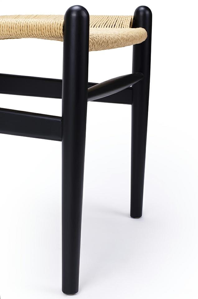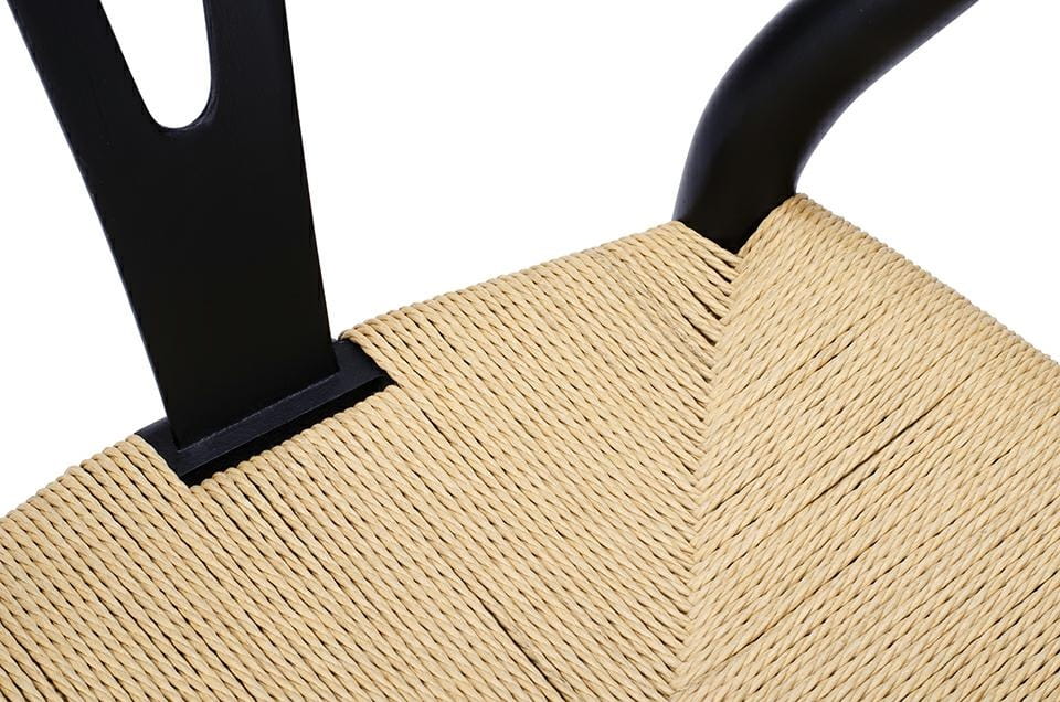 Jego siedzisko wykonane z jasnej plecionki nadaje mu lekkości i wyjątkowego uroku, podczas gdy solidny stelaż z czarnego drewna bukowego zapewnia stabilność i stylowy kontrast.