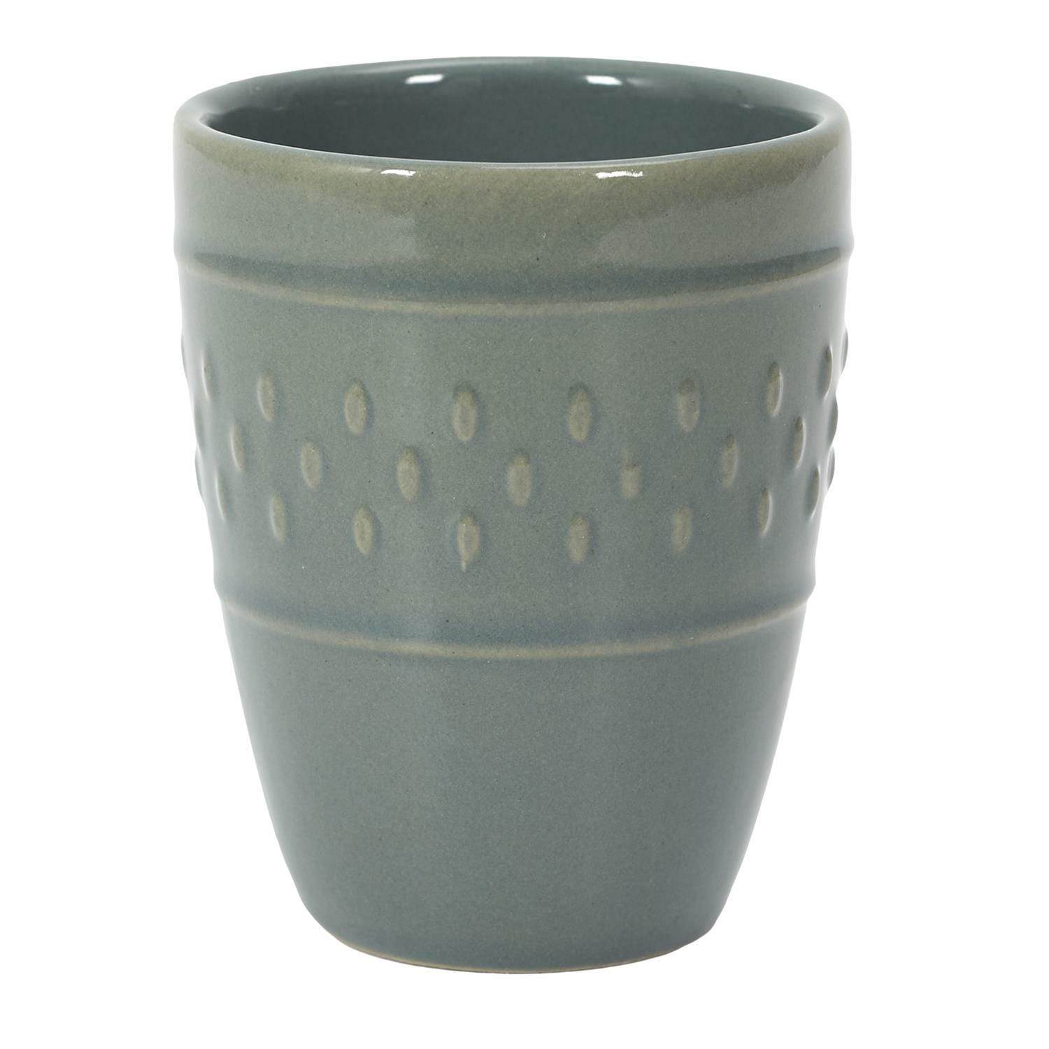 Kubek wykonany został z ceramiki i ozdobiony został ciekawymi równomiernymi wzorkami.
