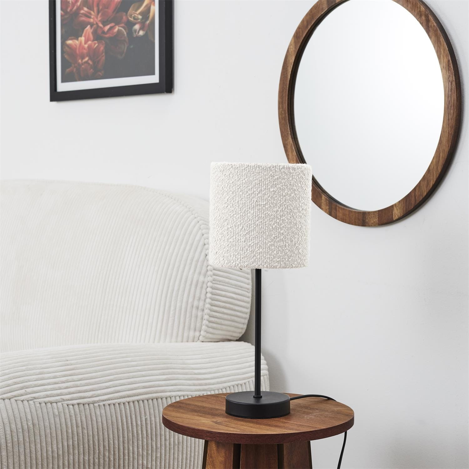 - Teksturalny klosz z tkaniny boucle – dodaje wnętrzu ciepła i stylu