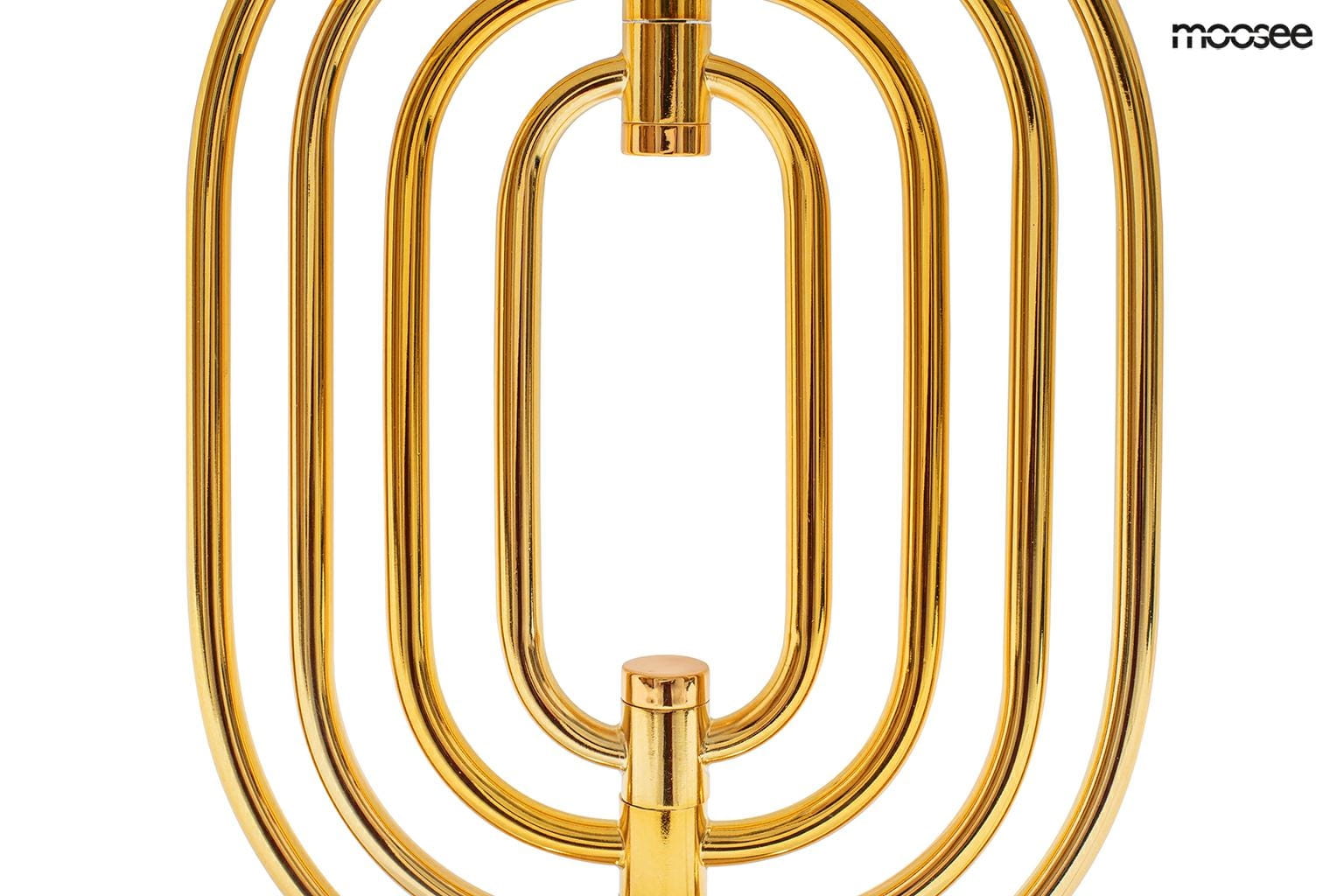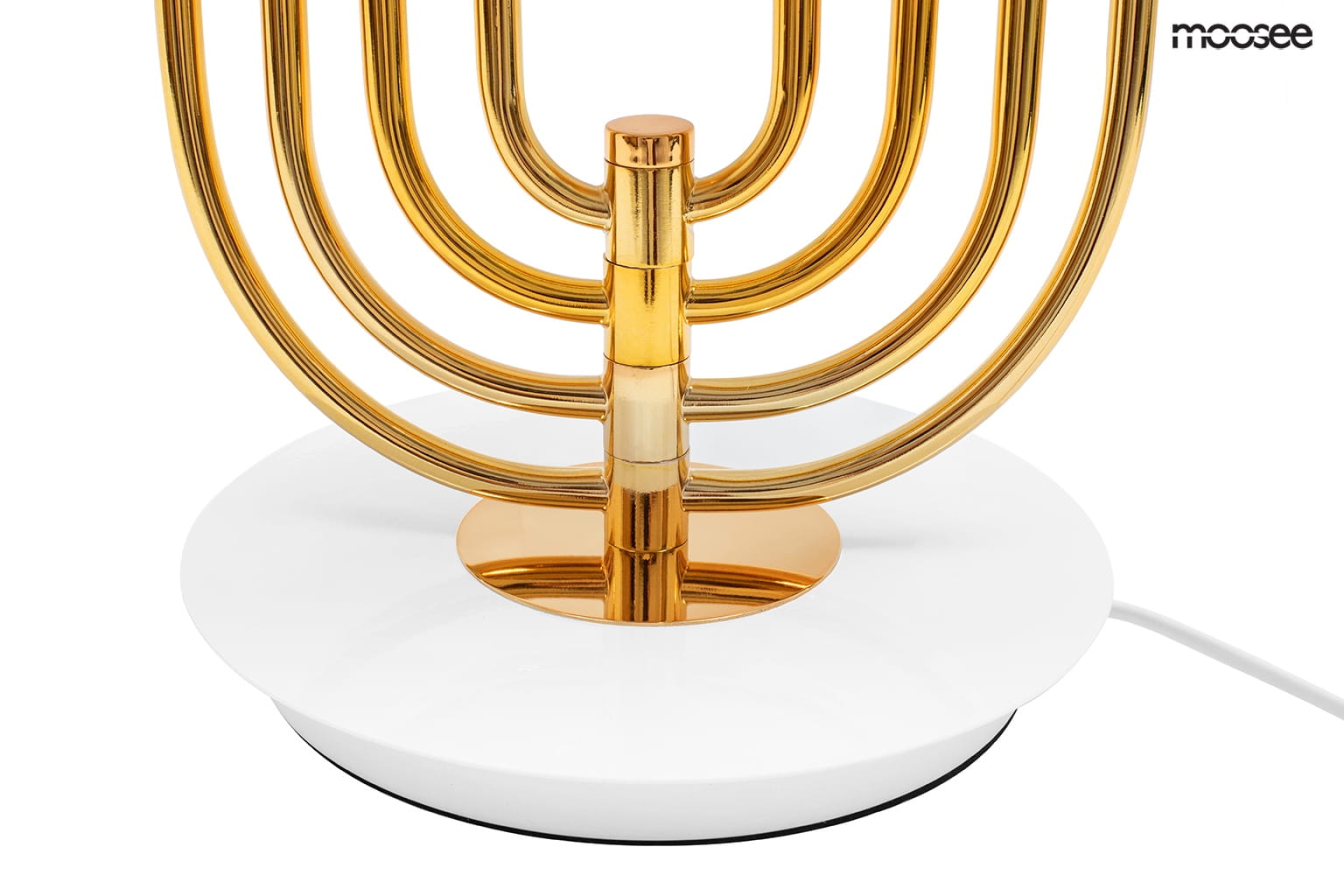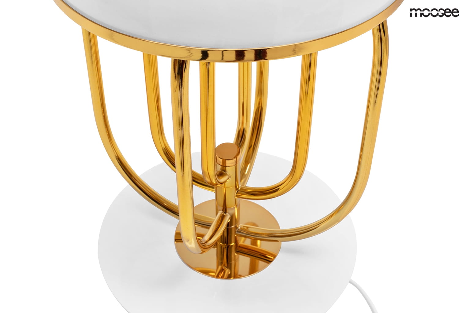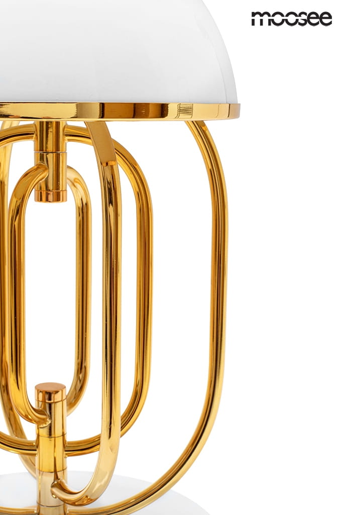 Lampa stołowa BOTTEGA marki MOOSEE to elegancka propozycja w stylu glamour, która łączy dekoracyjny charakter z funkcjonalnym oświetleniem. Złota stalowa konstrukcja w połączeniu z białym kloszem tworzy luksusowy, a zarazem ponadczasowy efekt.