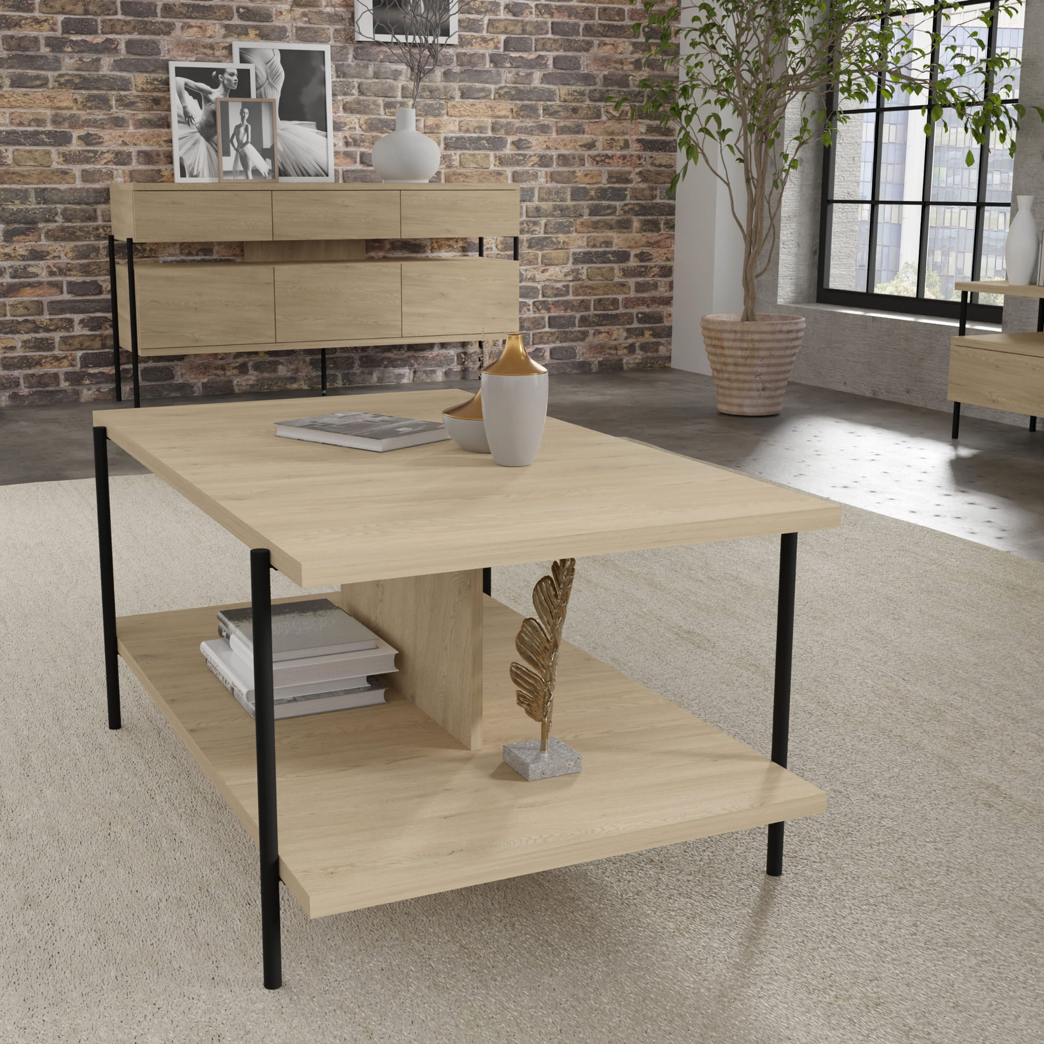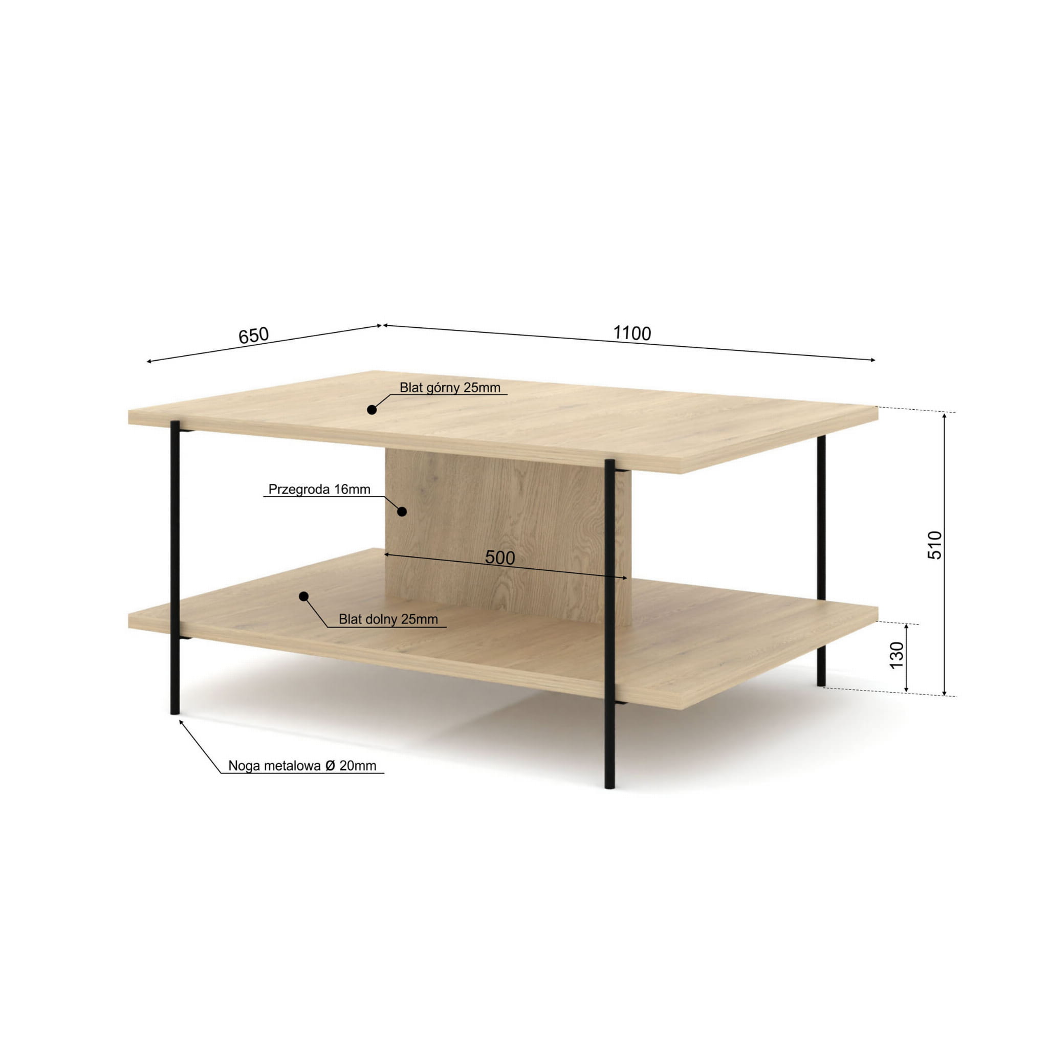 Charakterystyczny dekor dąb cremona w połączeniu z czarnymi, metalowymi nogami nadaje meblowi wyjątkowej elegancji. Dwa praktyczne blaty tworzą funkcjonalną przestrzeń – górny idealny do postawienia filiżanki kawy, dolny do przechowywania czasopism, książek lub dekoracji.