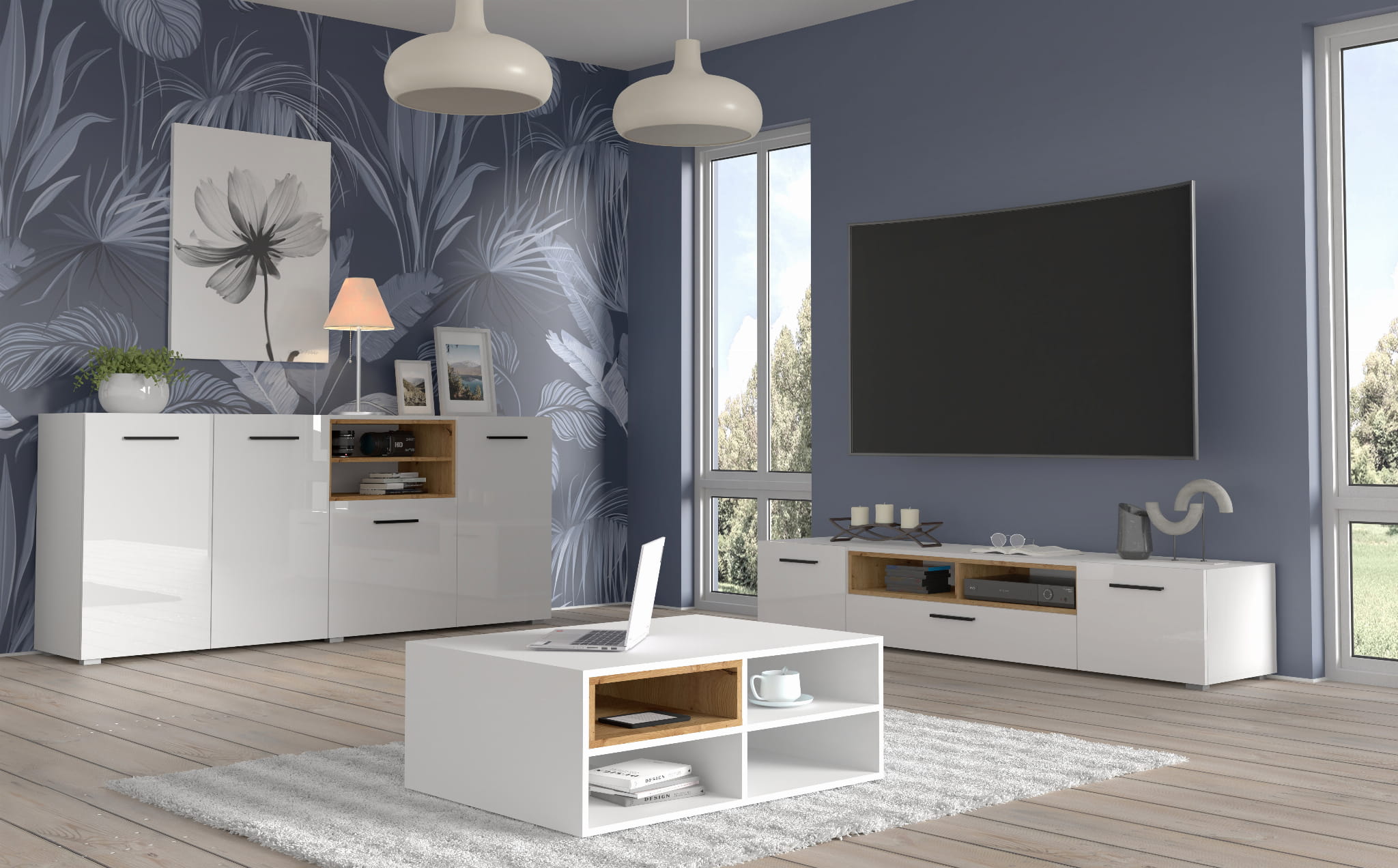 Ława Anette M to nowoczesny mebel, który zachwyca połączeniem białego matu z ciepłym wykończeniem w kolorze dębu artisan.