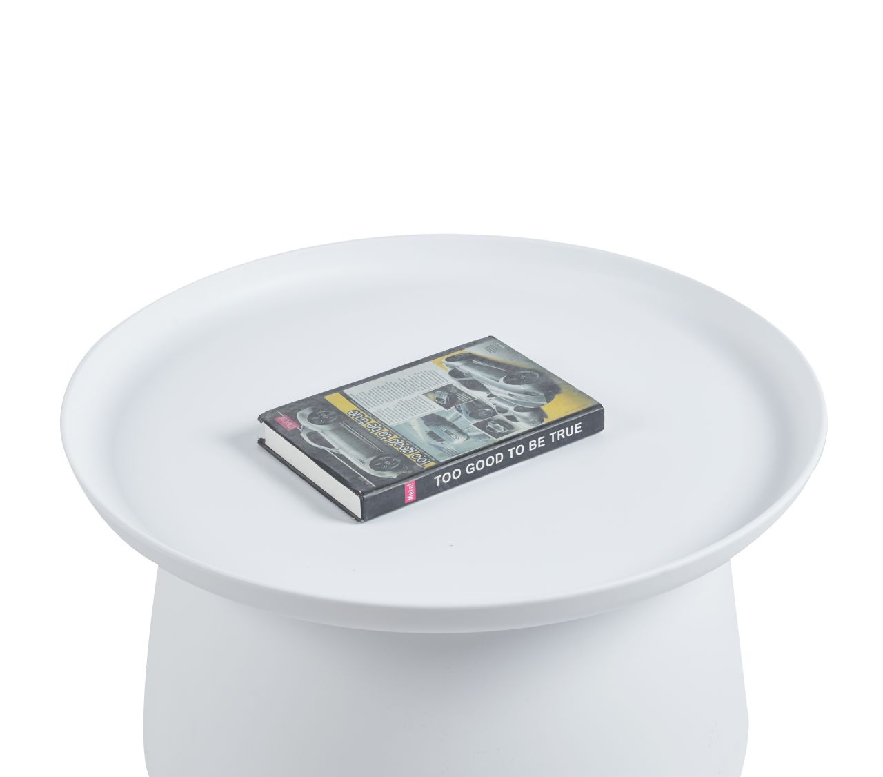 Okrągły blat o średnicy 70 cm zapewnia wygodną przestrzeń na filiżanki, dekoracje, książki lub codzienne drobiazgi.