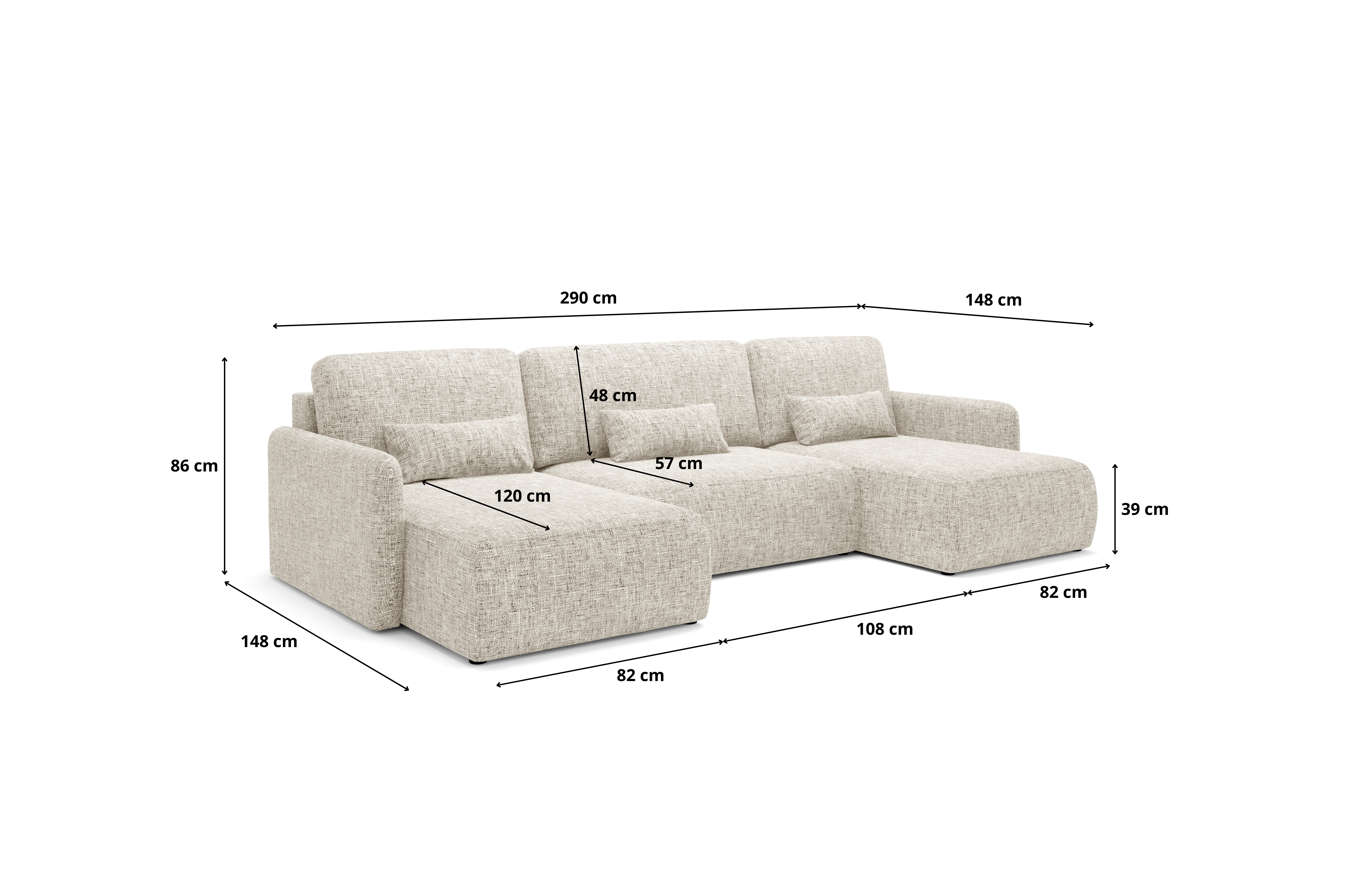 - Kształt U i duża powierzchnia wypoczynku – wygodny układ do salonu i komfort dla kilku osób