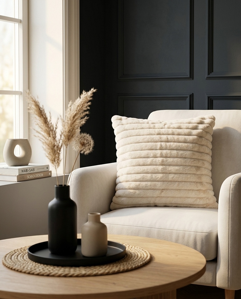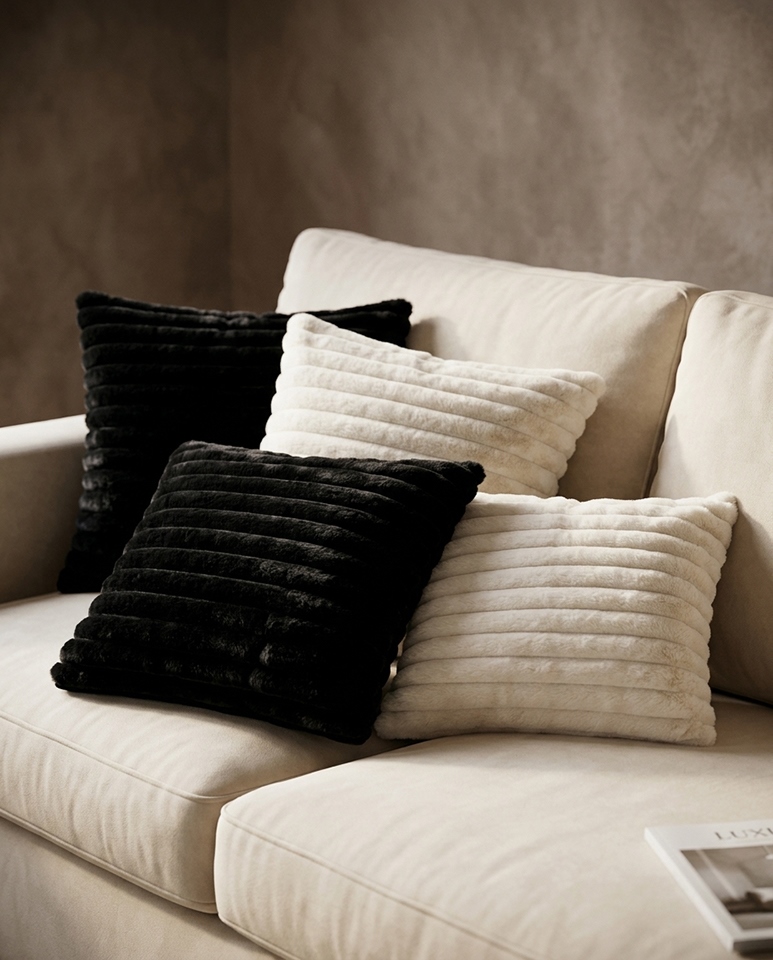 Czarna poduszka dekoracyjna świetnie komponuje się z jasnymi tkaninami, drewnem, beżami, szarościami oraz mocniejszymi kontrastami. Można ułożyć ją na sofie, fotelu lub łóżku, aby dodać przestrzeni przytulności i eleganckiego wykończenia.