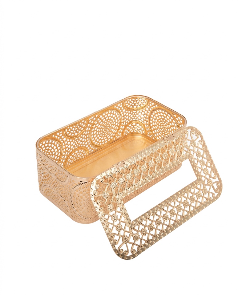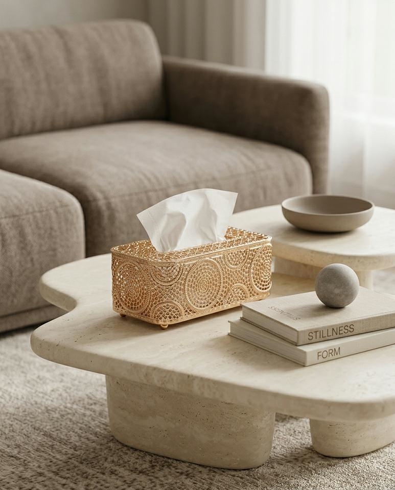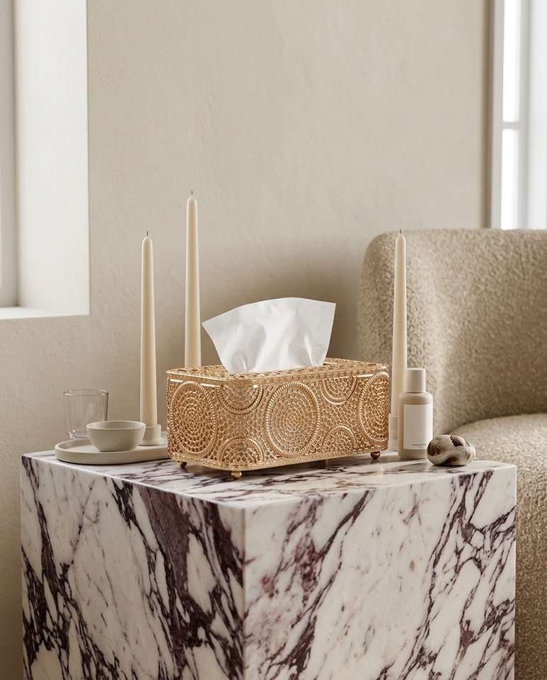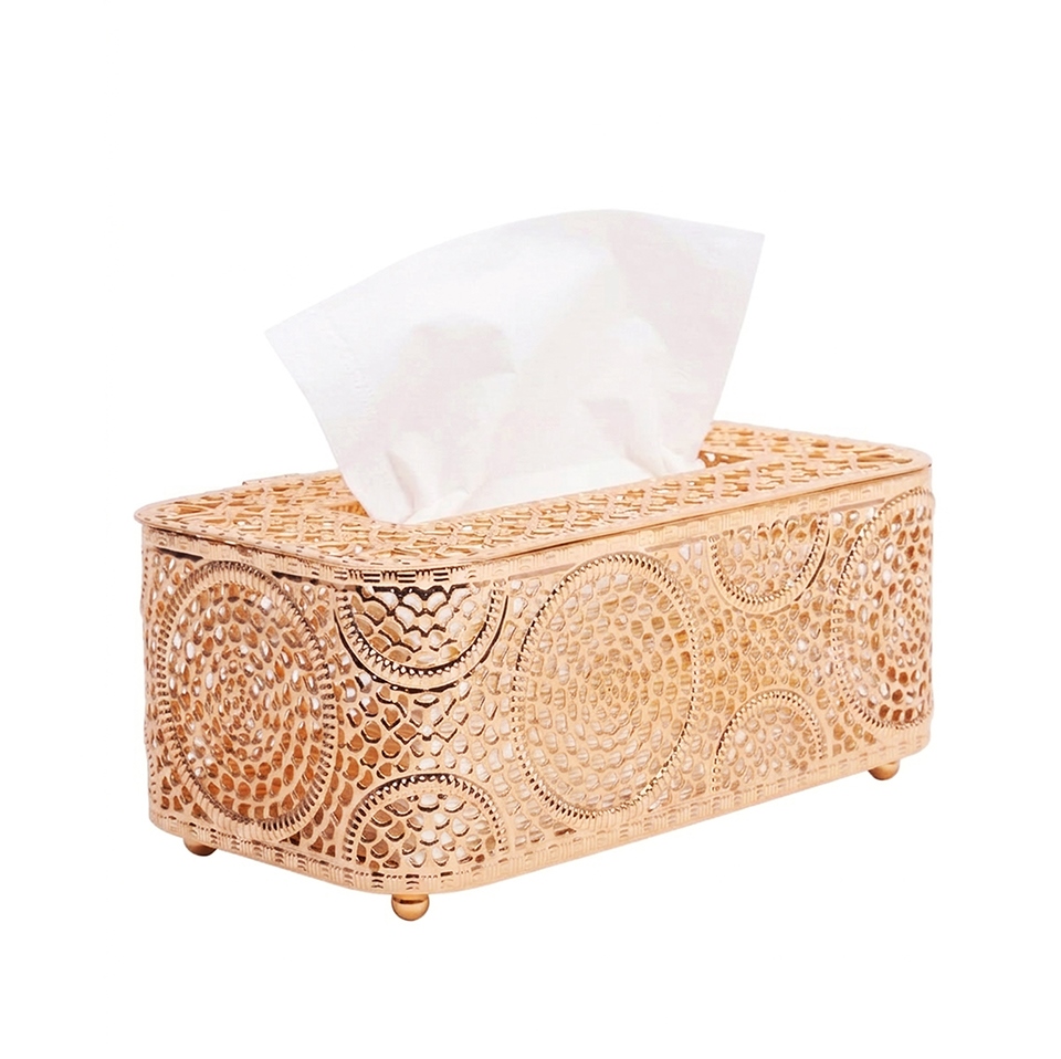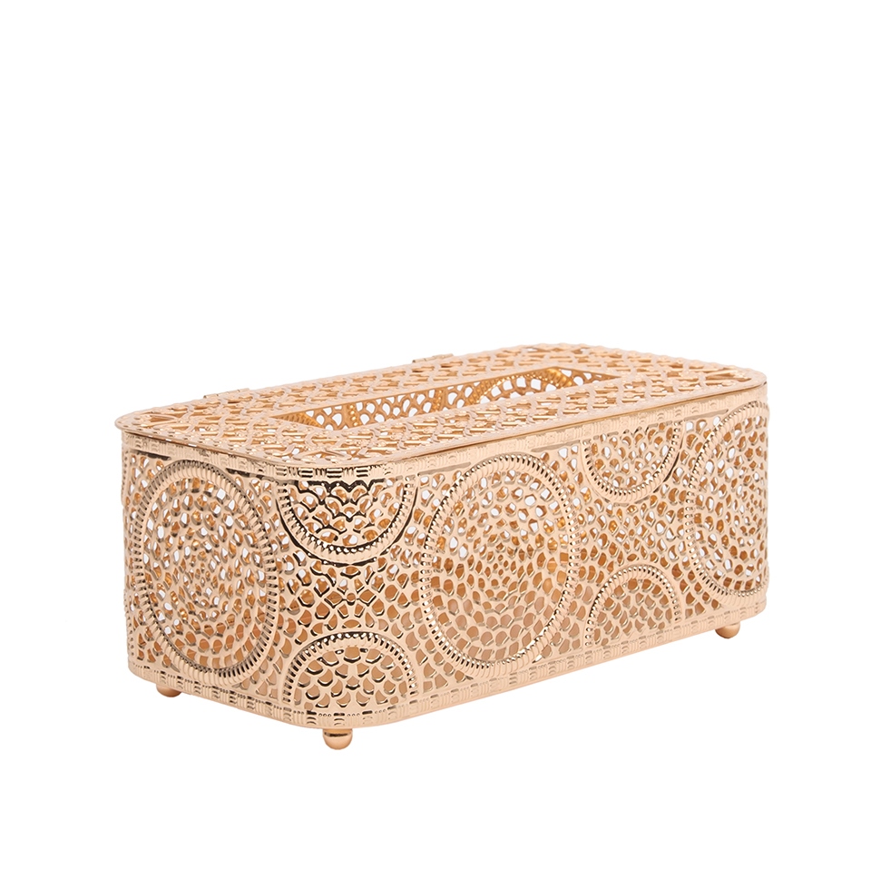 Ażurowa konstrukcja pięknie odbija światło, dodając wnętrzu lekkości i wyrafinowanego charakteru. To nie tylko funkcjonalny pojemnik na chusteczki, ale również ozdoba, która efektownie prezentuje się na stoliku kawowym, konsoli, komodzie, toaletce czy w łazience.