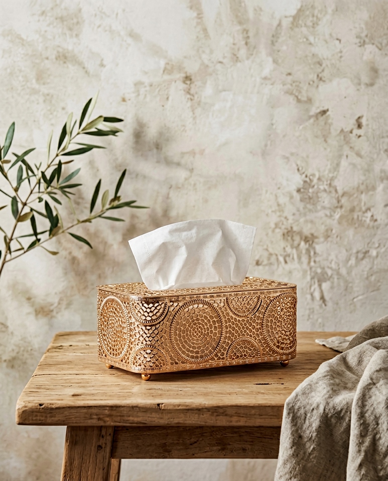Złoty pojemnik na chusteczki to detal, który potrafi odmienić charakter aranżacji i podkreślić dbałość o każdy element wyposażenia. To świetny wybór dla osób, które cenią dodatki premium, funkcjonalność oraz ponadczasowy design w codziennym użytkowaniu.