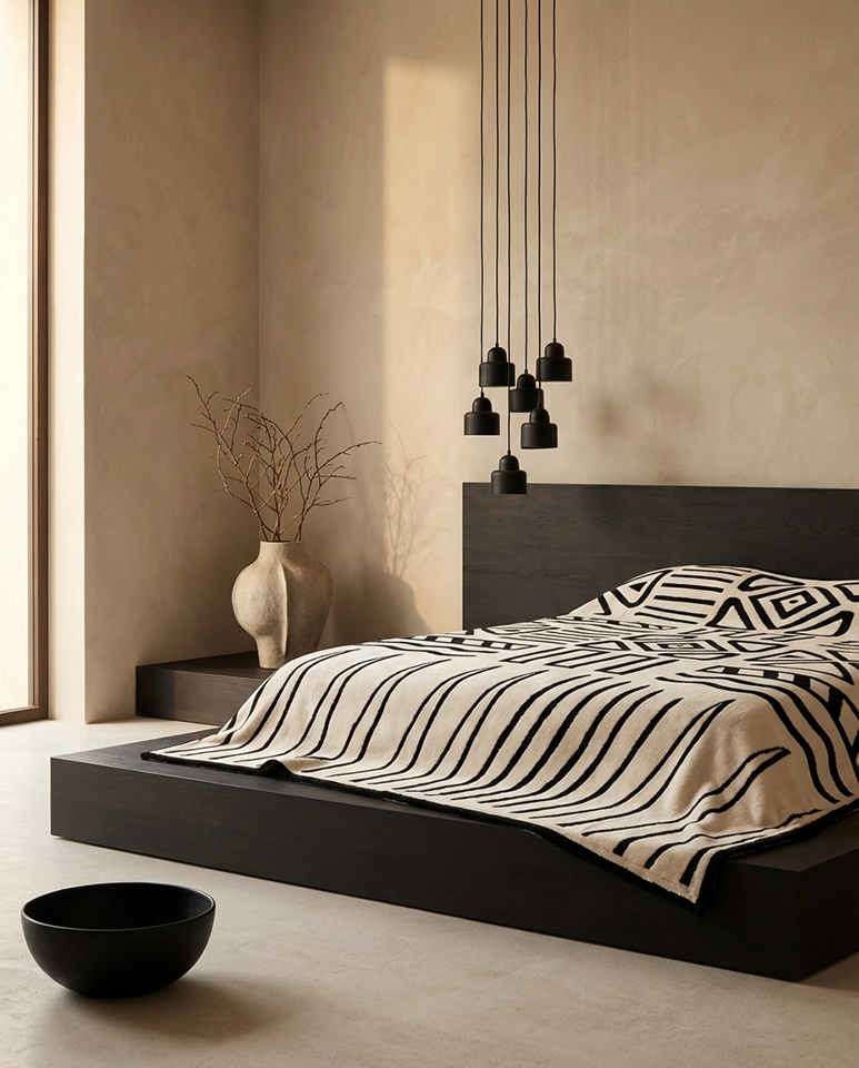 Wyrazisty wzór w beżowo-czarnej kolorystyce przyciąga uwagę i nadaje aranżacji nowoczesny, oryginalny charakter.