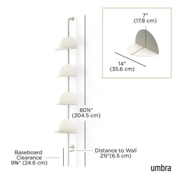 System składa się z czterech półokrągłych półek wykonanych z wytrzymałej, giętej stali, zamontowanych na smukłym, pionowym słupku.