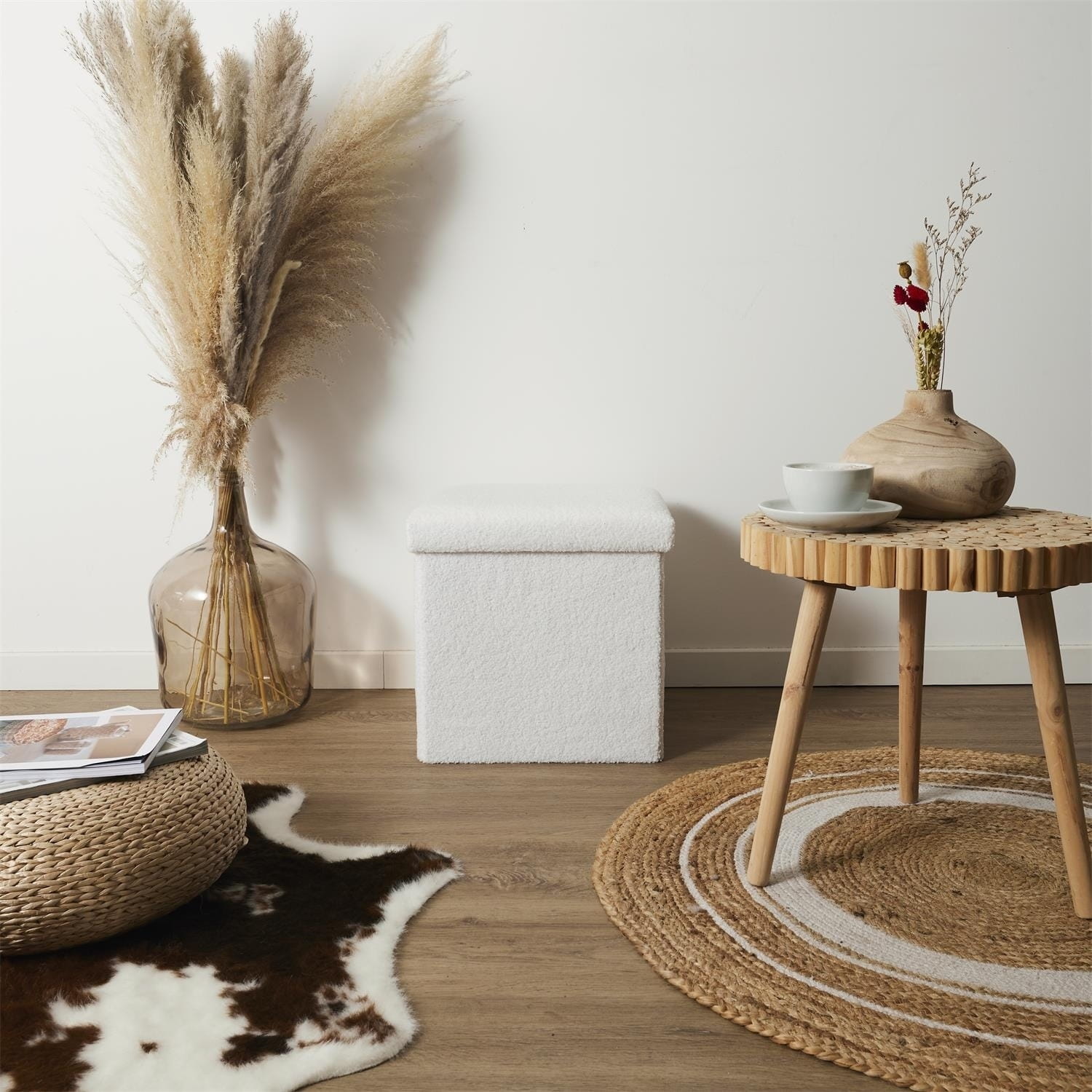 Składana pufa marki Intesi to funkcjonalny i stylowy dodatek, który sprawdzi się zarówno jako siedzisko, jak i pojemnik do przechowywania. Jej ponadczasowy wygląd i miękka w dotyku tkanina boucle dodają wnętrzu przytulności i elegancji.