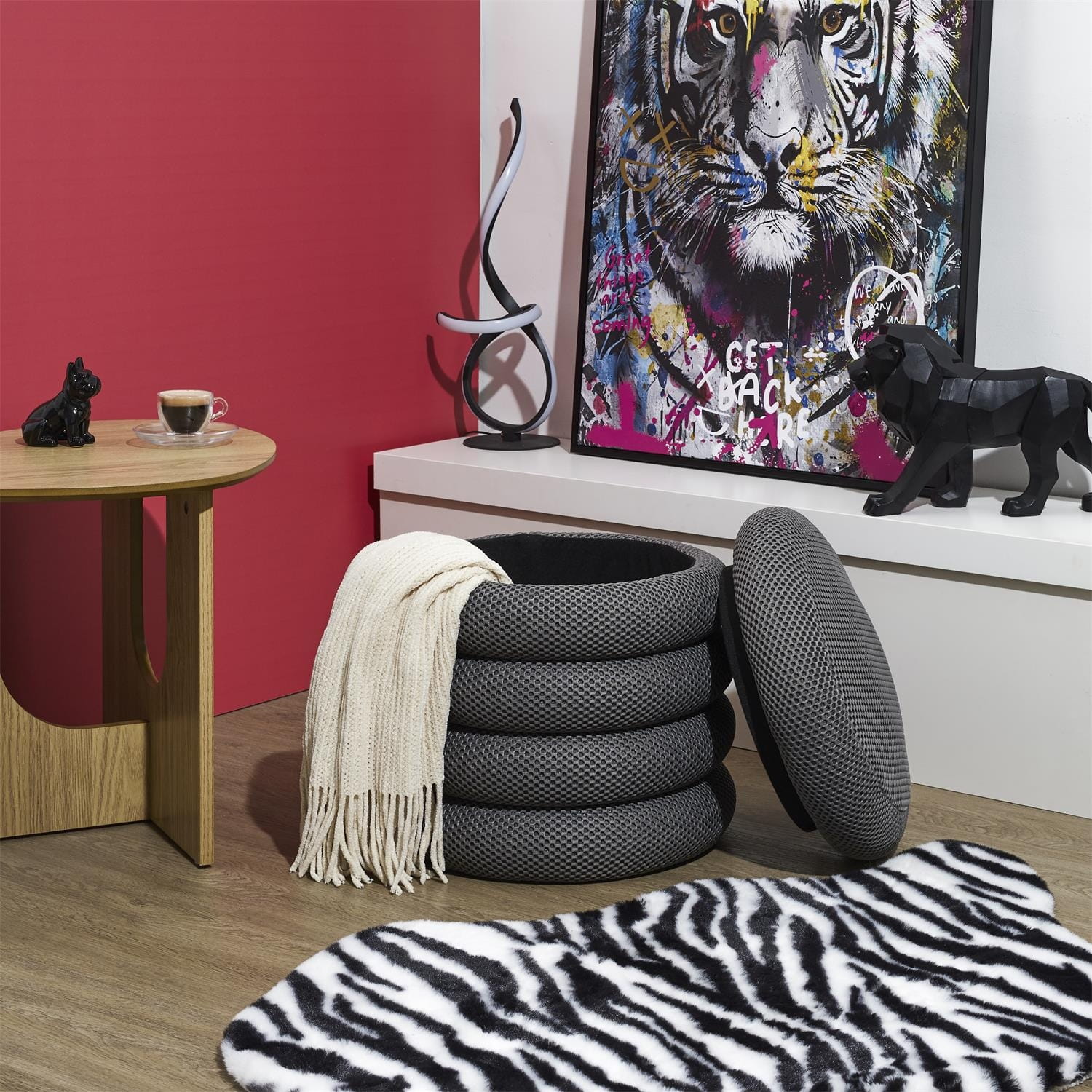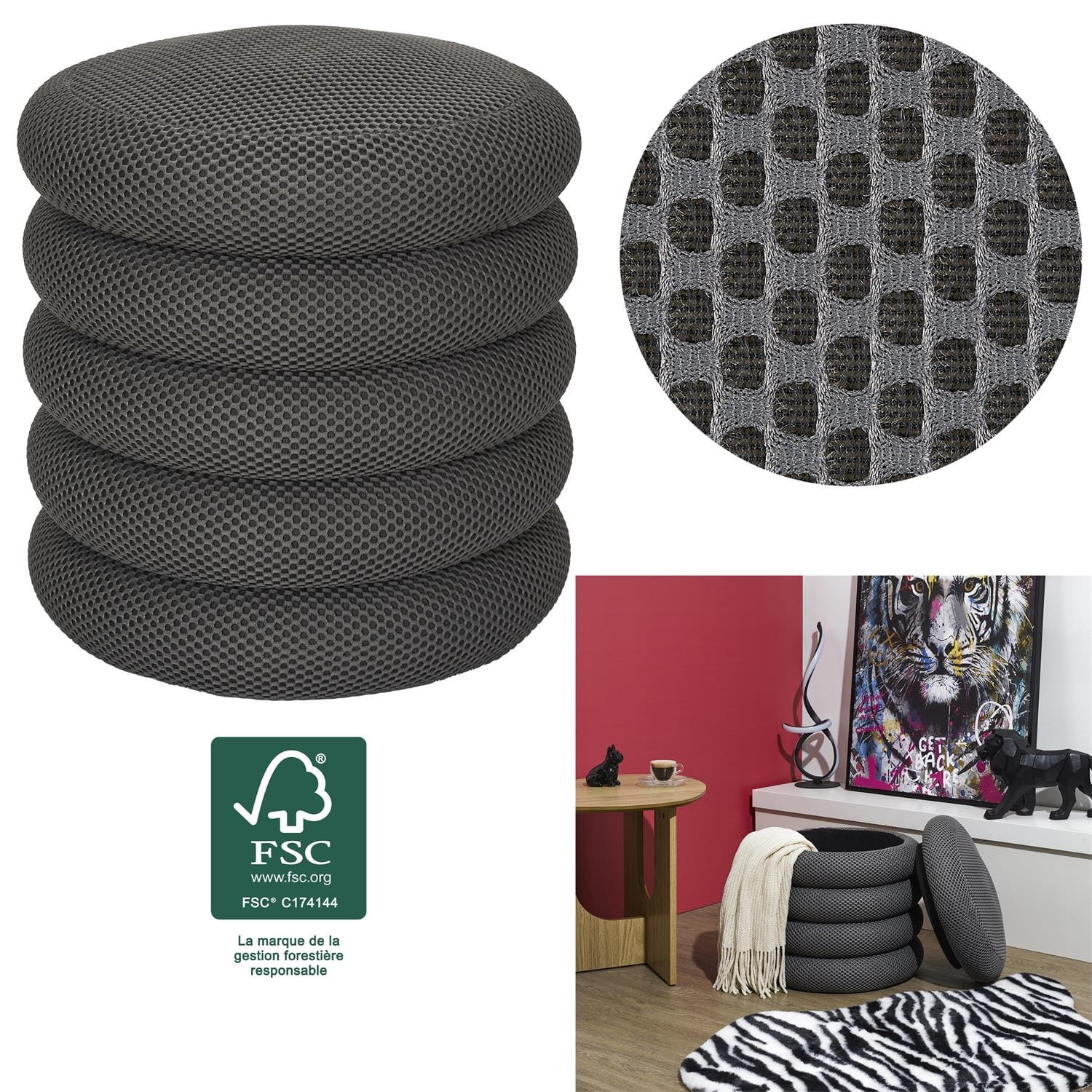 Pufa ATOM szara – trójwymiarowa tkanina / funkcja schowka