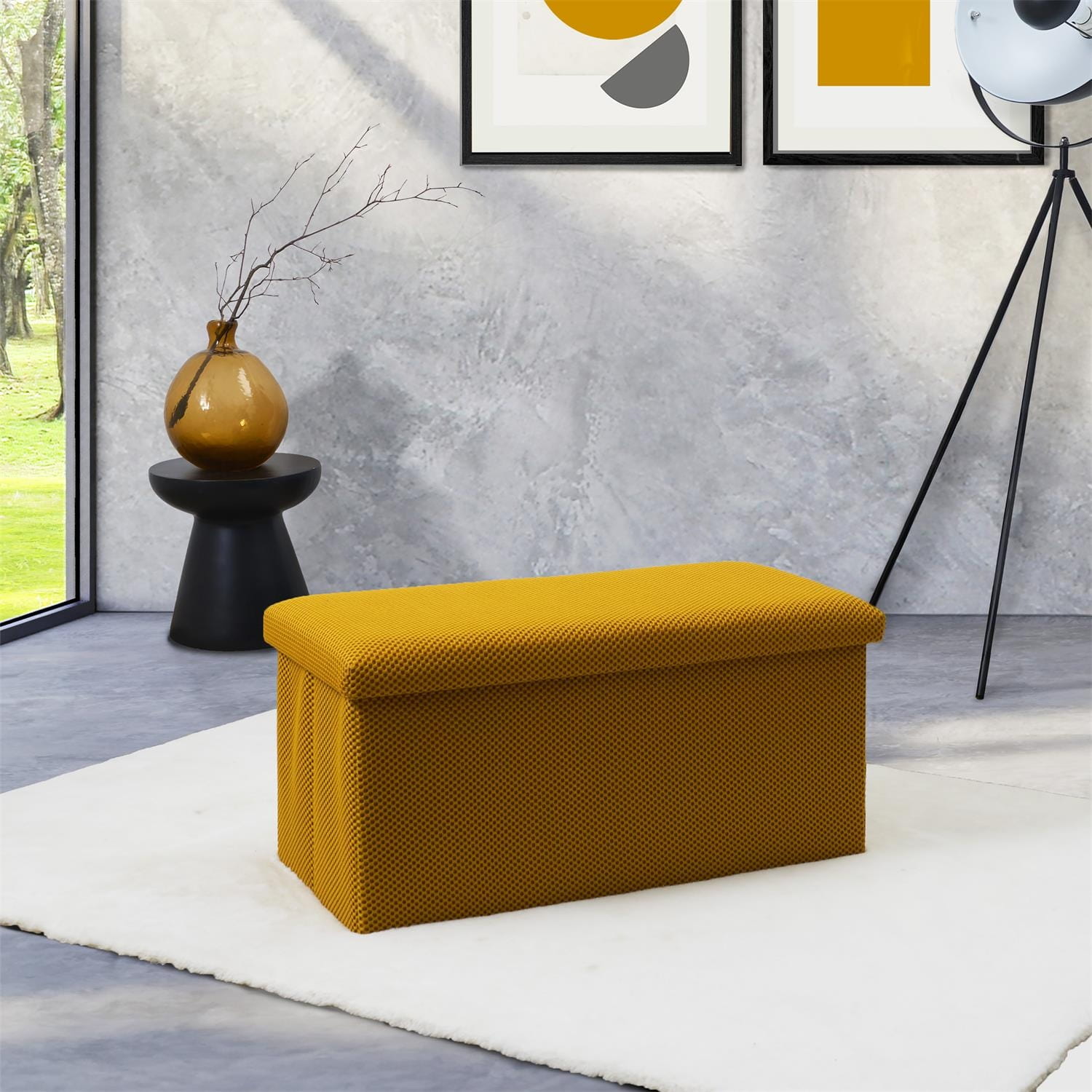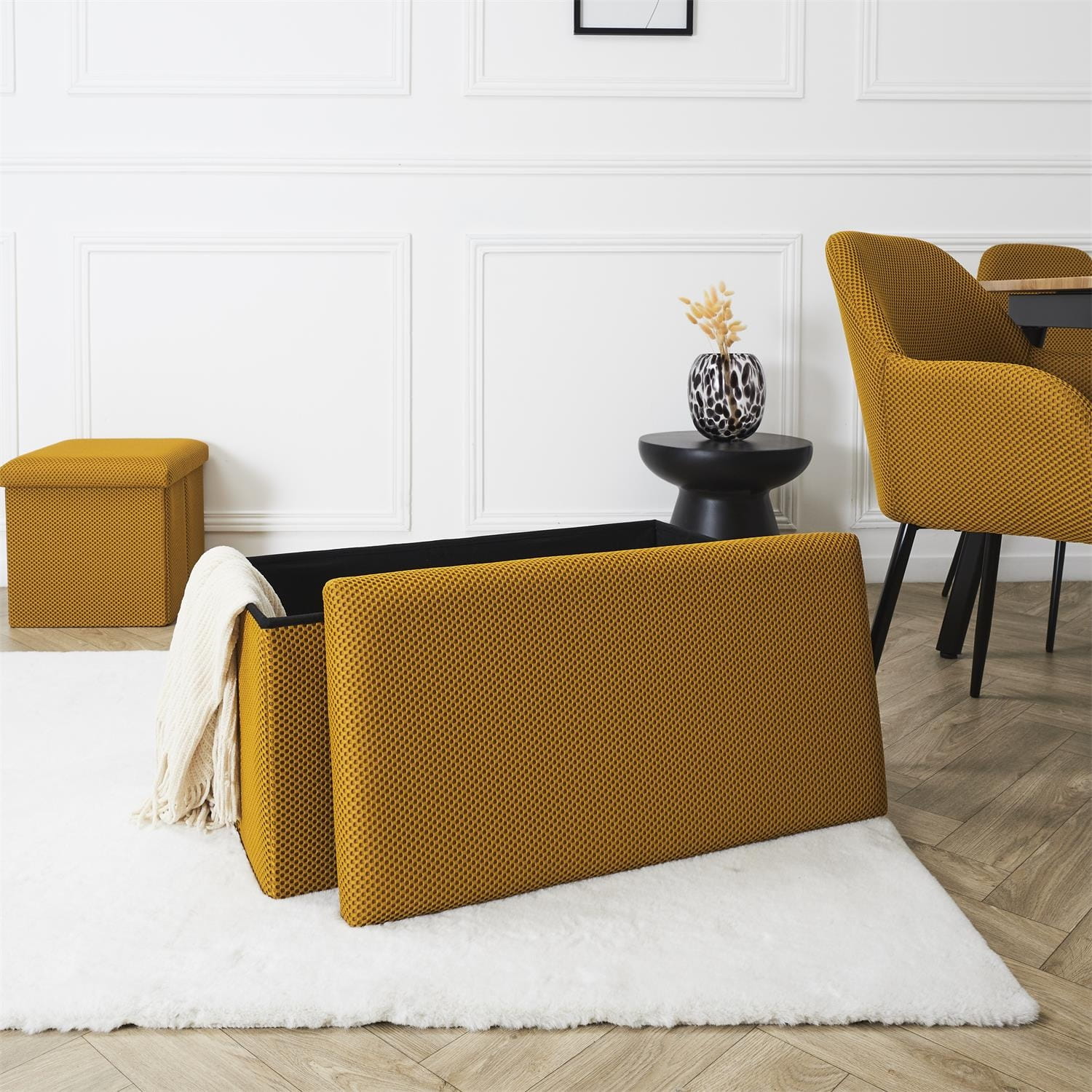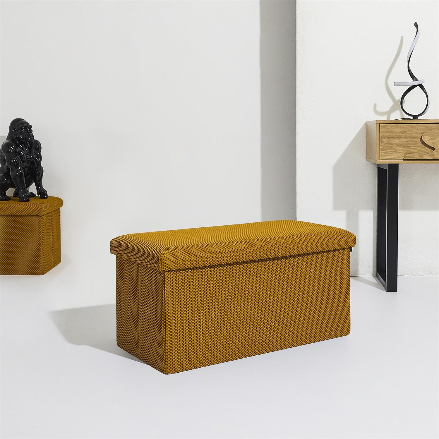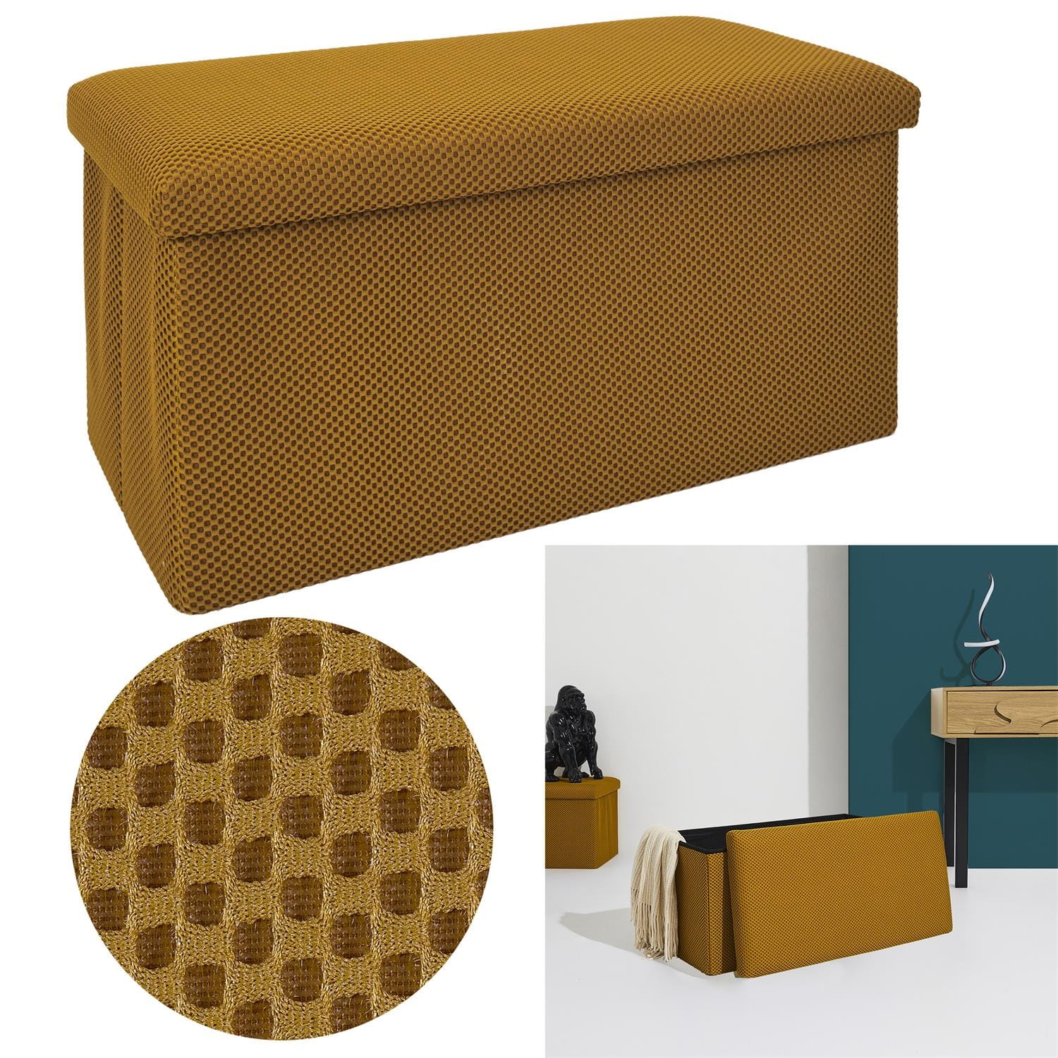Składana pufa żółta ze schowkiem – trójwymiarowa tkanina / MDF
