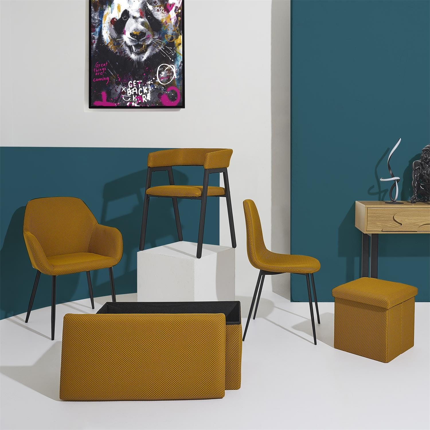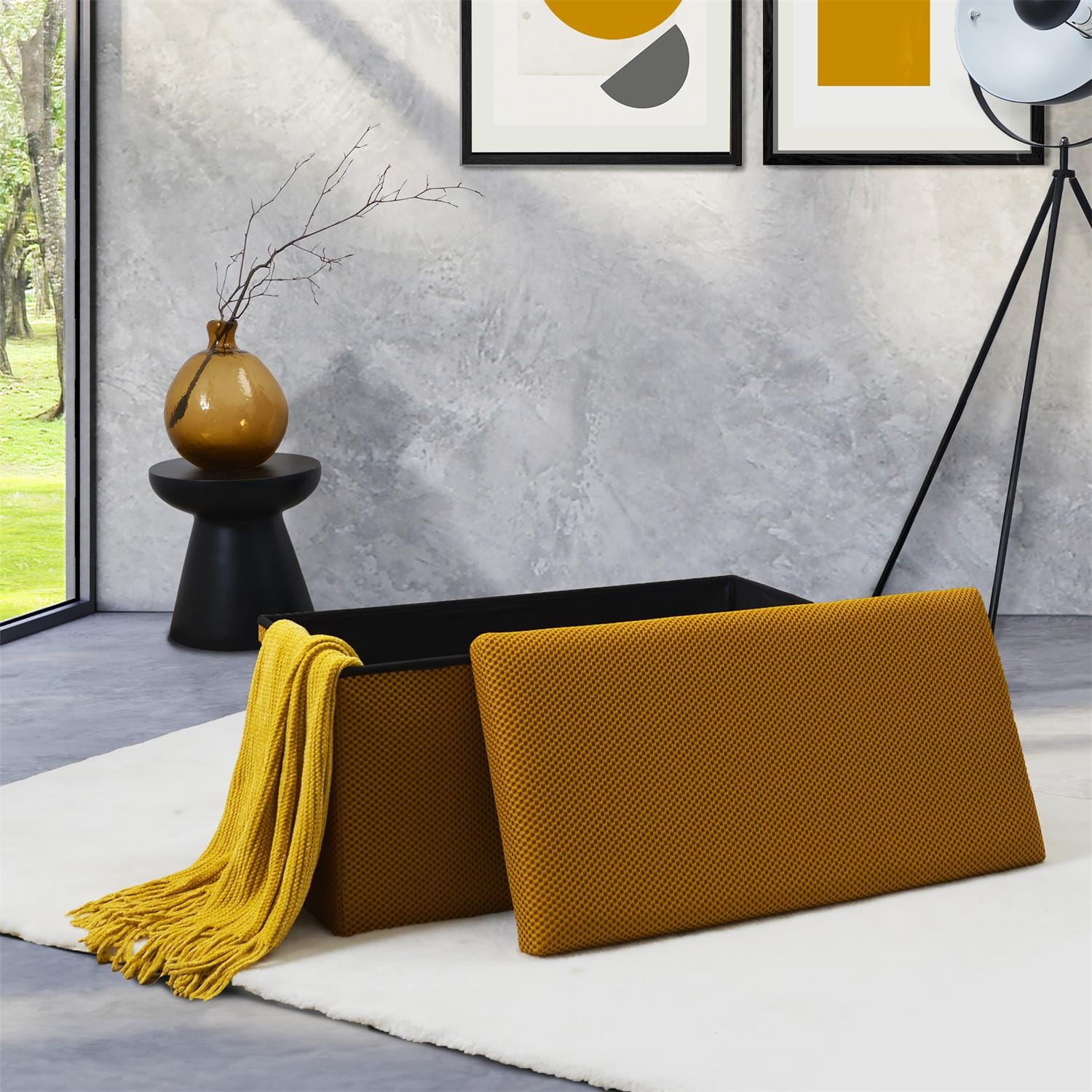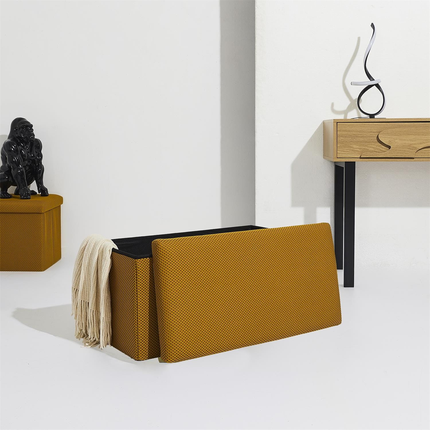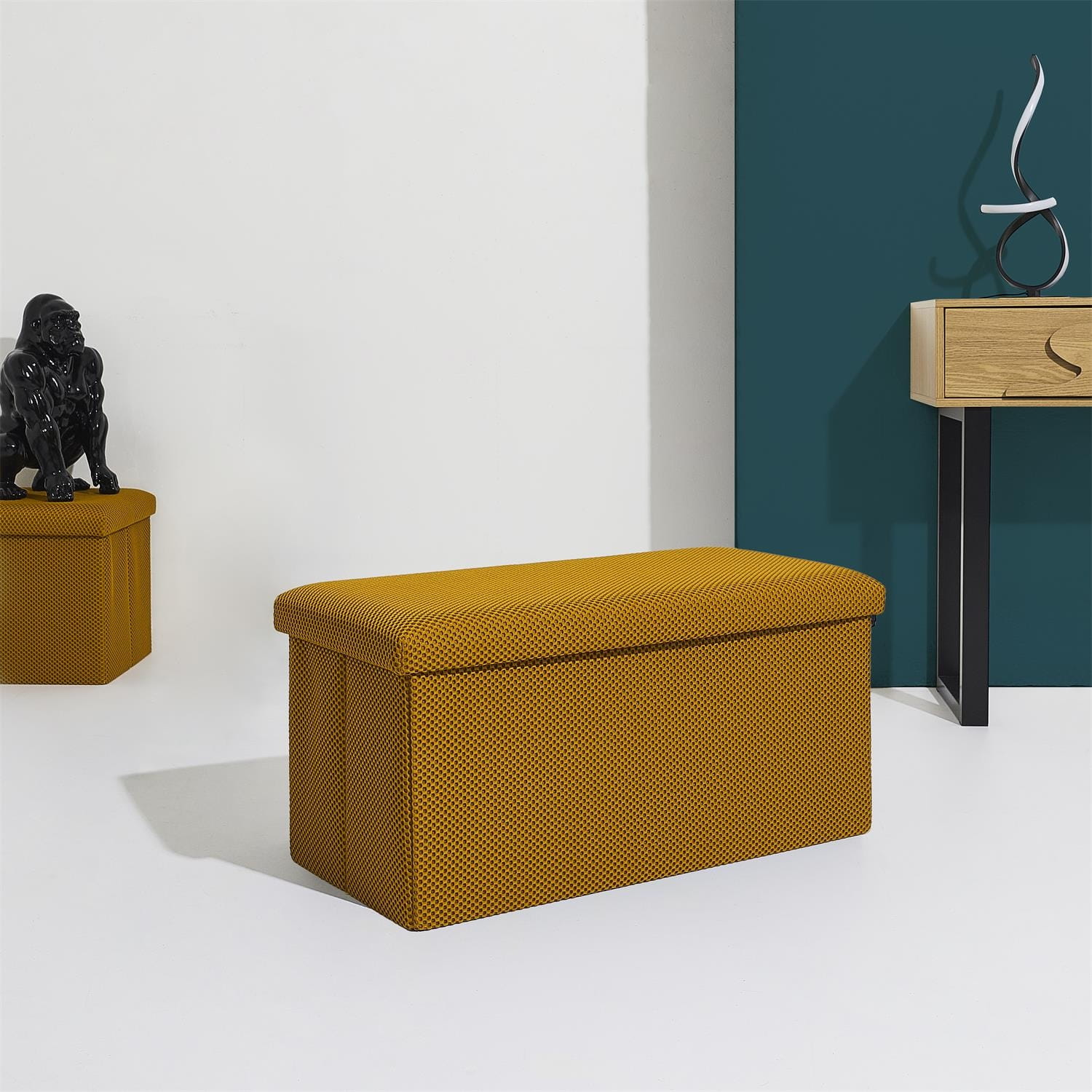 Składana pufa żółta ze schowkiem – trójwymiarowa tkanina / MDF