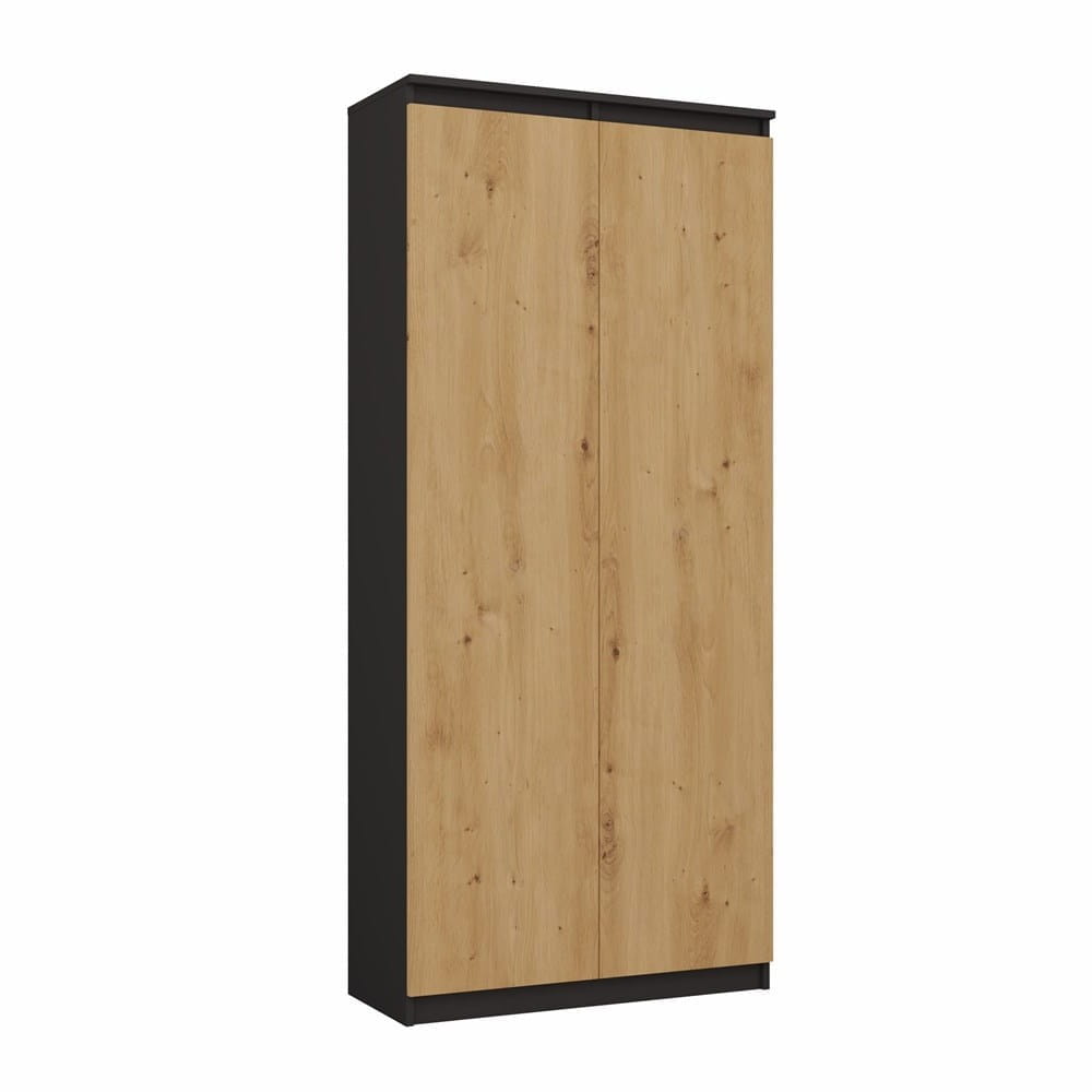 Mebel wyposażony jest w 8 praktycznych półek ukrytych za drzwiami, dzięki czemu łatwo zachować estetykę i harmonijny wygląd wnętrza. Wyróżnia go eleganckie zestawienie kolorystyczne: antracyt + dąb artisan — połączenie nowoczesności z akcentem naturalnego drewna.