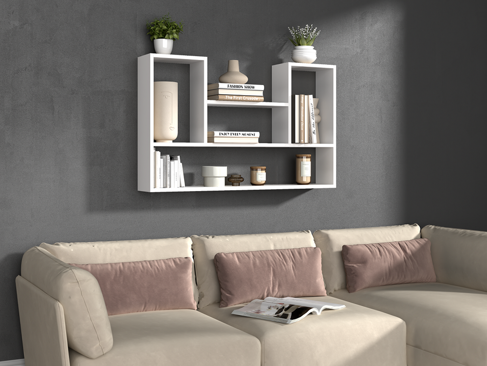 Regał może pełnić funkcję dekoracyjną, a także praktyczną – doskonale nadaje się jako mała biblioteczka na książki, dokumenty czy drobne akcesoria. Zawieszony nad komodą lub szafką RTV tworzy spójną i elegancką aranżację, nadając wnętrzu harmonii i stylu.