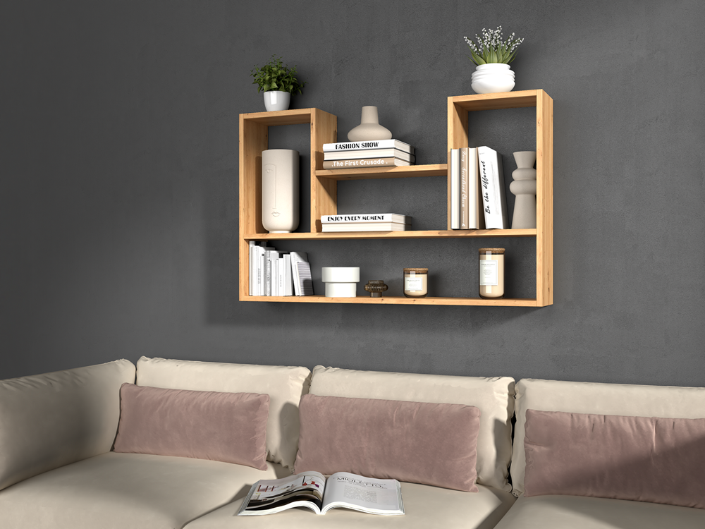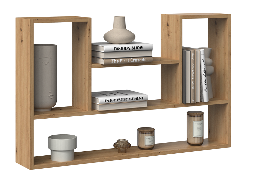 Regał może pełnić funkcję dekoracyjną, a także praktyczną – doskonale nadaje się jako mała biblioteczka na książki, dokumenty czy drobne akcesoria. Zawieszony nad komodą lub szafką RTV tworzy spójną i elegancką aranżację, nadając wnętrzu harmonii i stylu.