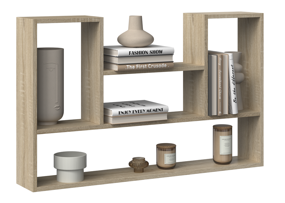 Regał może pełnić funkcję dekoracyjną, a także praktyczną – doskonale nadaje się jako mała biblioteczka na książki, dokumenty czy drobne akcesoria. Zawieszony nad komodą lub szafką RTV tworzy spójną i elegancką aranżację, nadając wnętrzu harmonii i stylu.