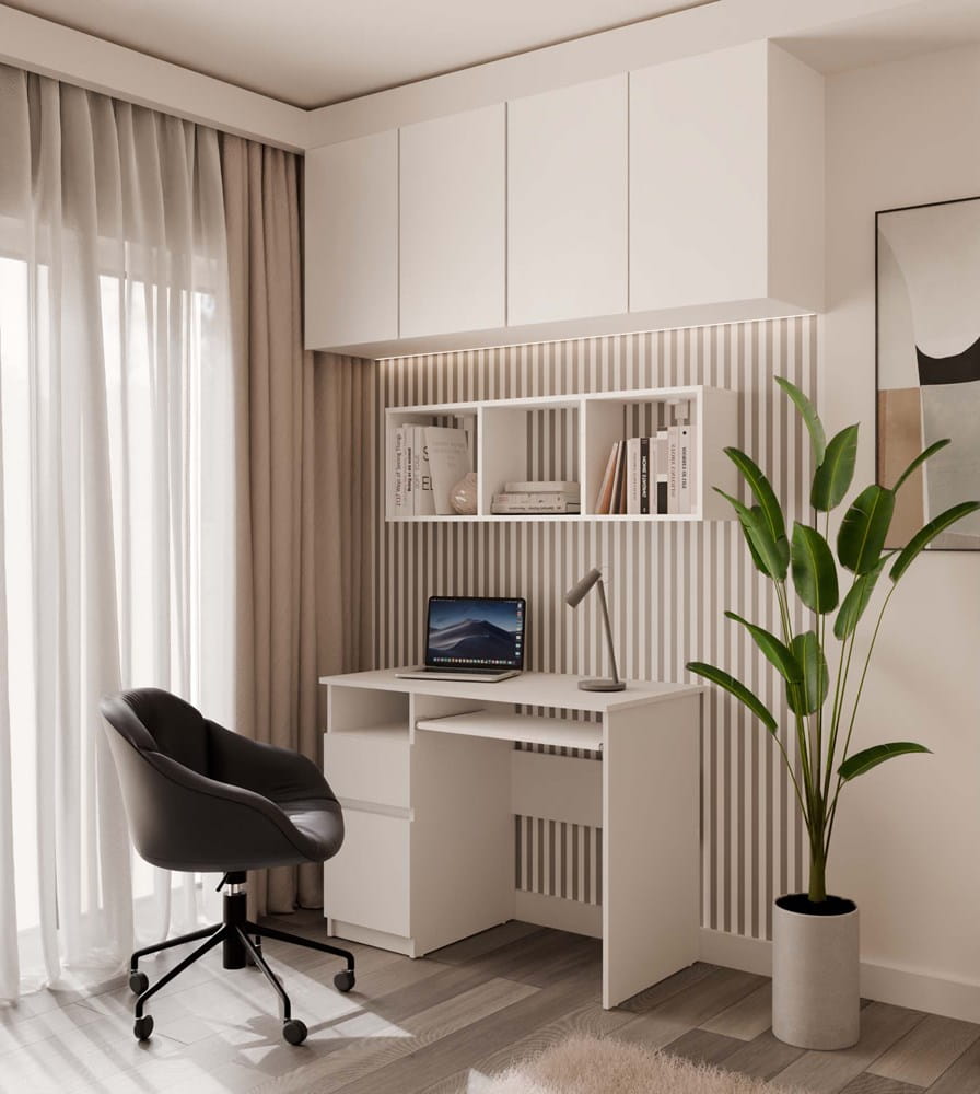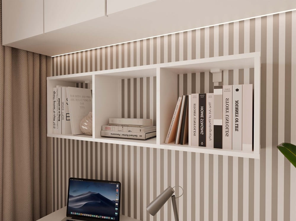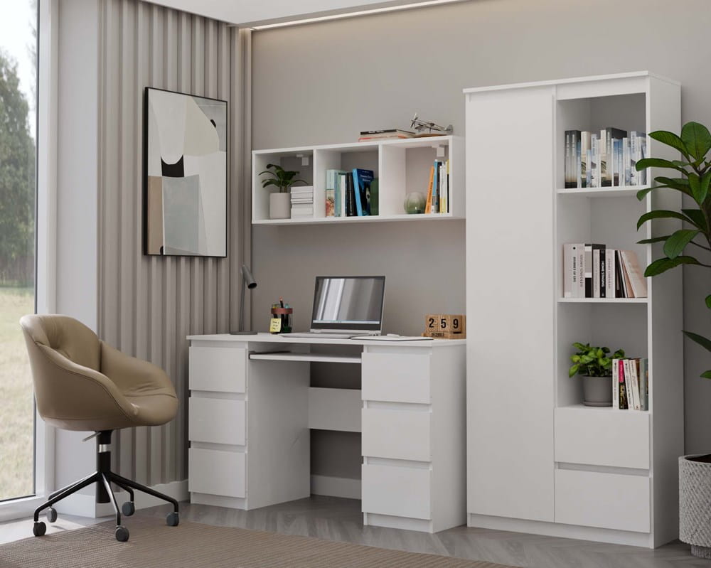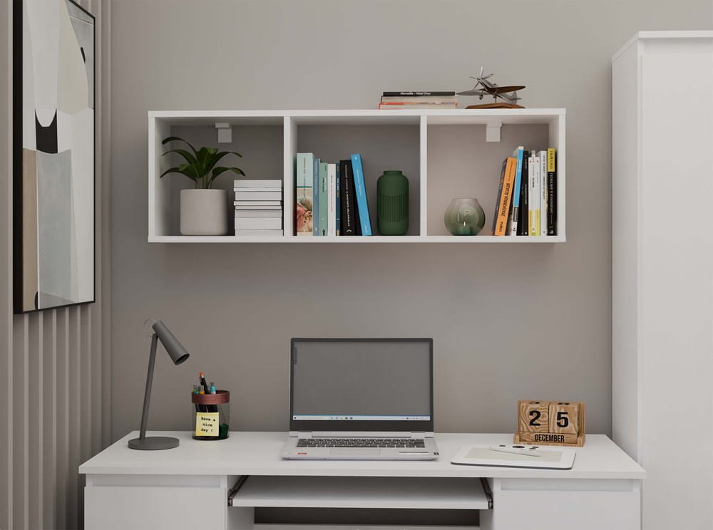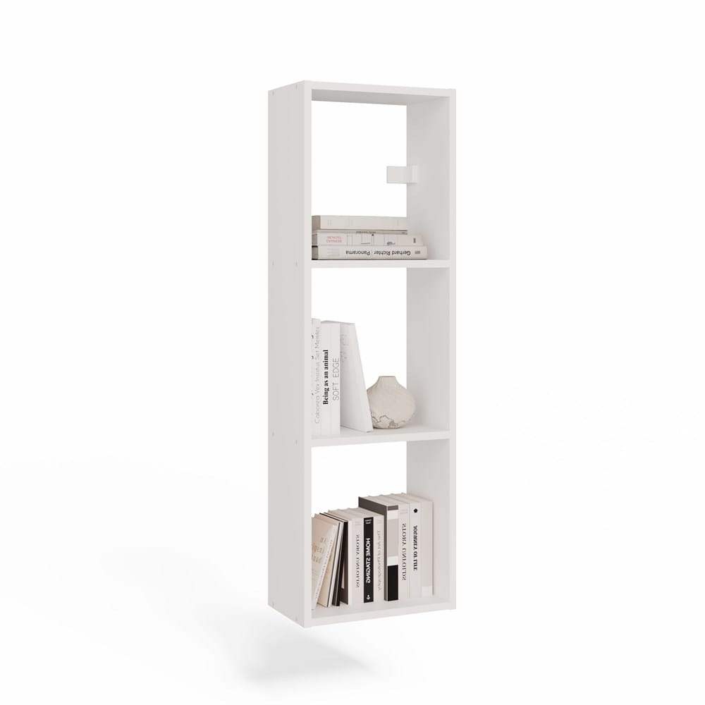 Jego atutem jest elastyczny montaż – możesz powiesić go w pionie lub poziomie, dopasowując układ do własnych potrzeb i przestrzeni. Nowoczesny design w białym macie sprawia, że regał pasuje do salonu, sypialni, biura czy pokoju młodzieżowego.