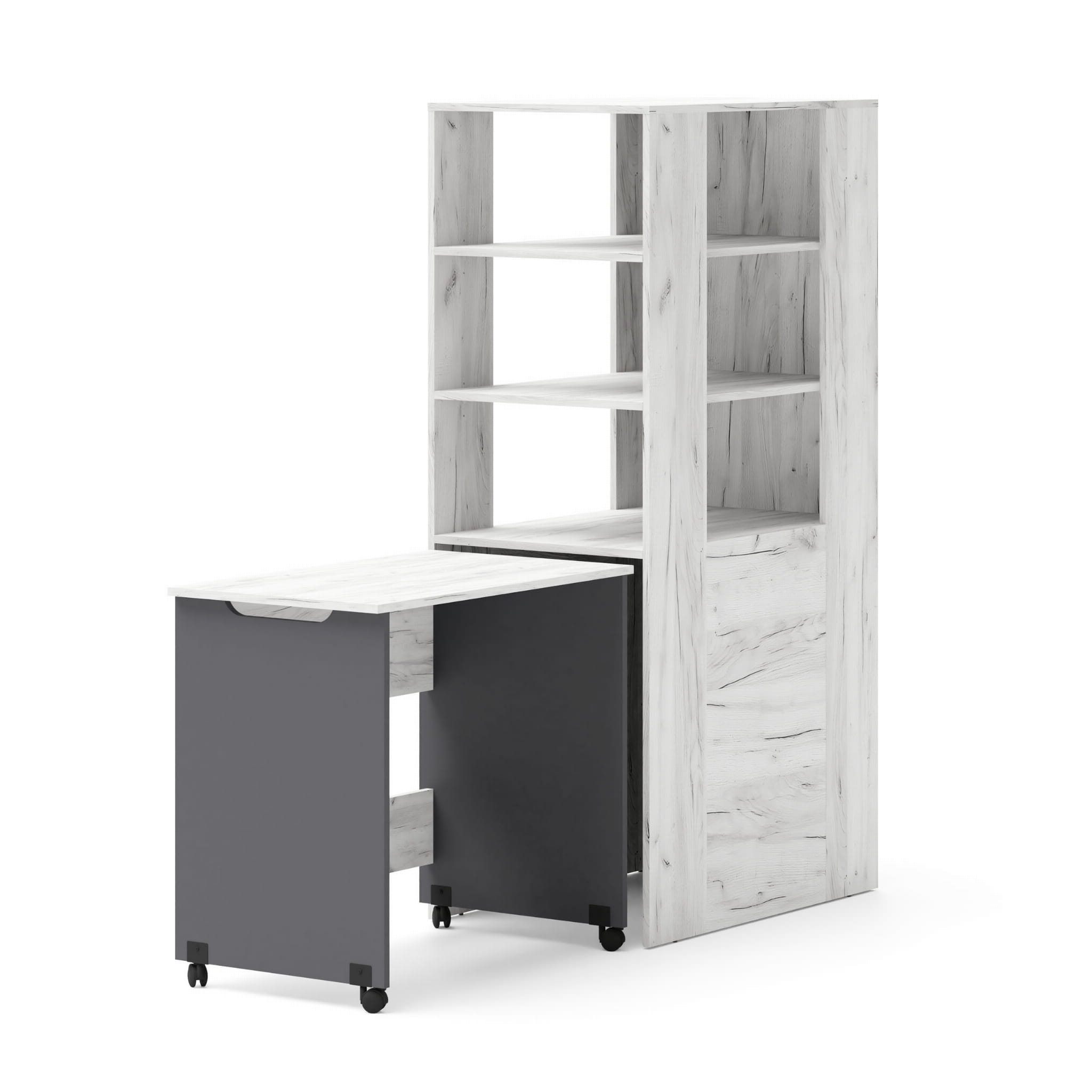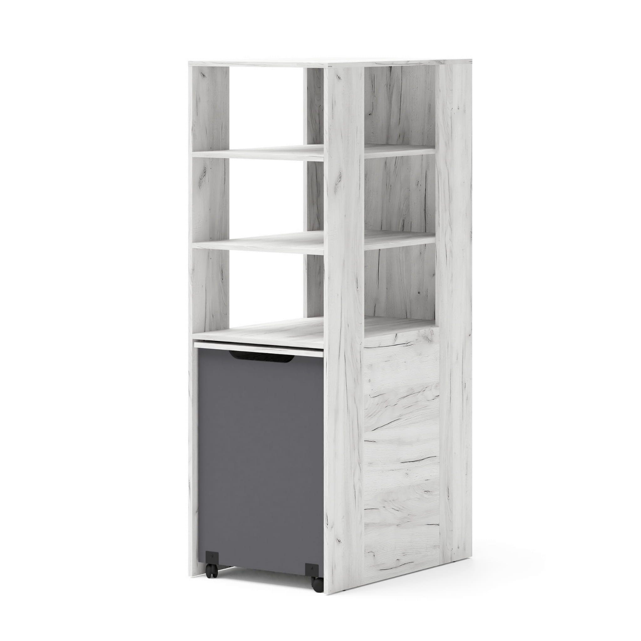 Połączenie kolorów craft biały i grafit tworzy elegancki kontrast, który dodaje wnętrzu charakteru i świeżości. Mobilne biurko na kółkach można łatwo wysunąć i wsunąć pod regał, co pozwala oszczędzić miejsce i zachować porządek.