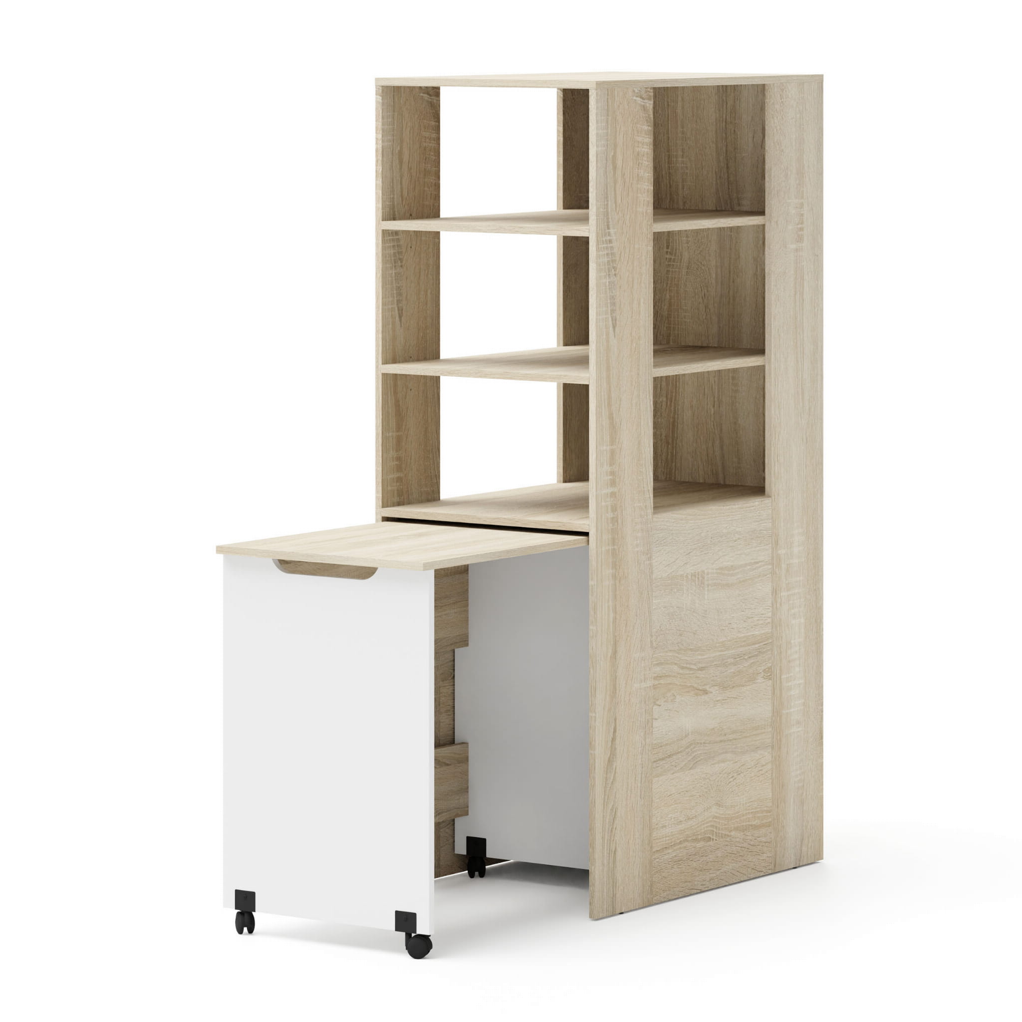 Połączenie dekoru dąb sonoma z białym matem tworzy harmonijny i nowoczesny efekt wizualny, który rozjaśnia wnętrze i dodaje mu lekkości. Mobilne biurko na kółkach można w prosty sposób wsunąć pod regał, co pozwala oszczędzić miejsce i utrzymać porządek.