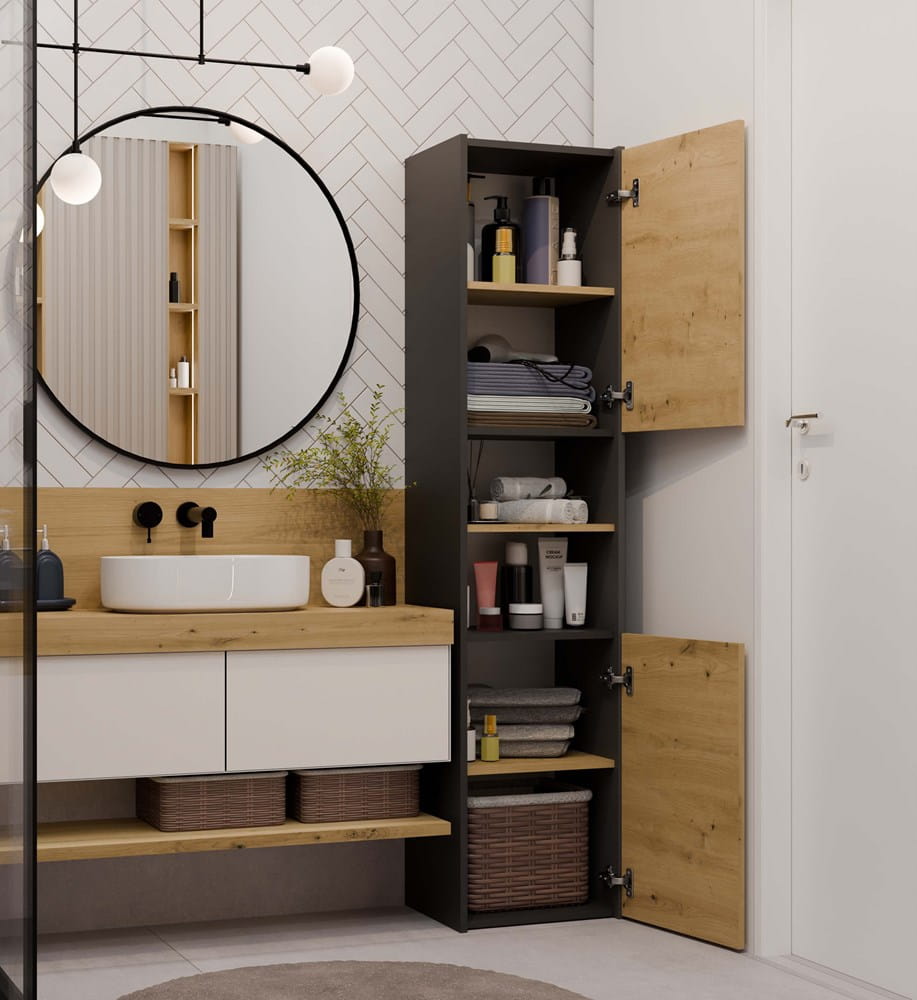 Dzięki kompaktowym wymiarom skutecznie organizuje przestrzeń, oferując miejsce na kosmetyki, ręczniki i inne akcesoria, nie zajmując przy tym dużo miejsca.