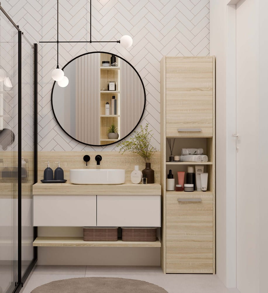 Uniwersalny, prosty design w odcieniu drewna świetnie komponuje się zarówno z jasnymi, jak i ciemnymi płytkami. Subtelne, minimalistyczne uchwyty dodają meblowi nowoczesnego charakteru i zapewniają wygodne otwieranie szafki oraz drzwiczek.