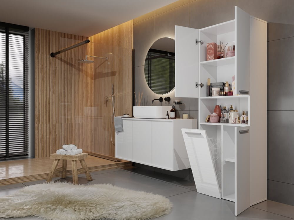 Słupek łazienkowy z jednym koszem na pranie, biały połysk Nel 1K/DK