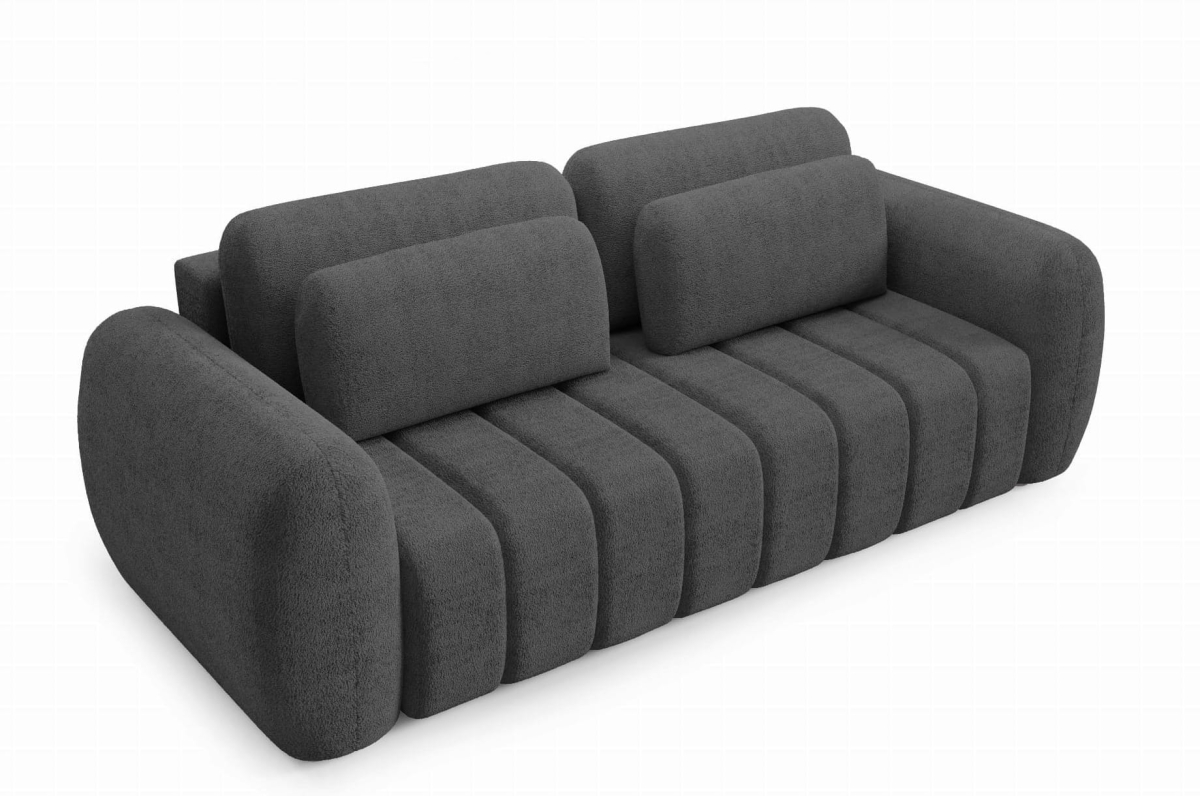 Wbudowany pojemnik na pościel ułatwia przechowywanie, a tapicerowany tył pozwala ustawić sofę także na środku pomieszczenia.