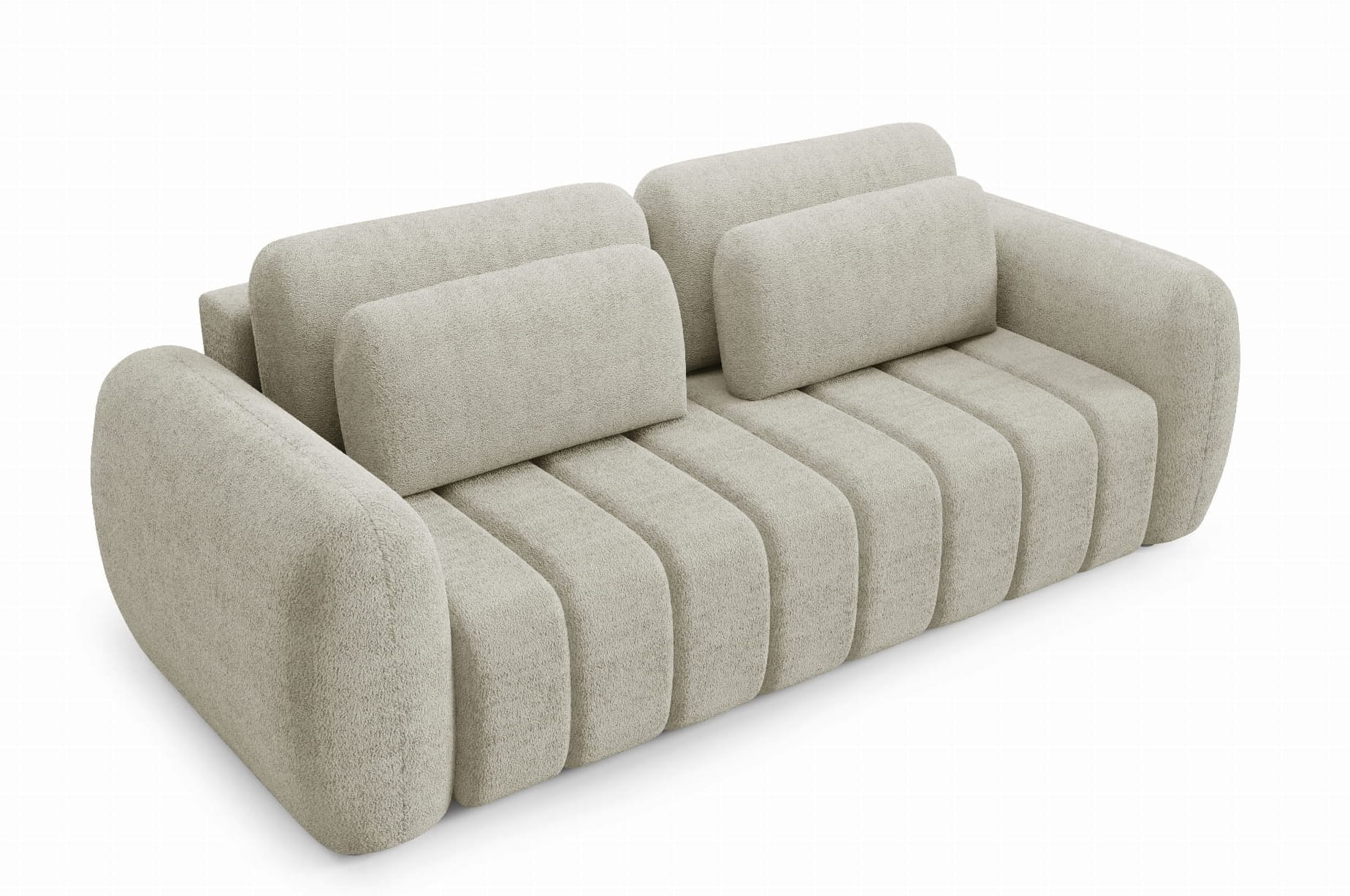 Wbudowany pojemnik na pościel ułatwia przechowywanie, a tapicerowany tył pozwala ustawić sofę także na środku pomieszczenia.