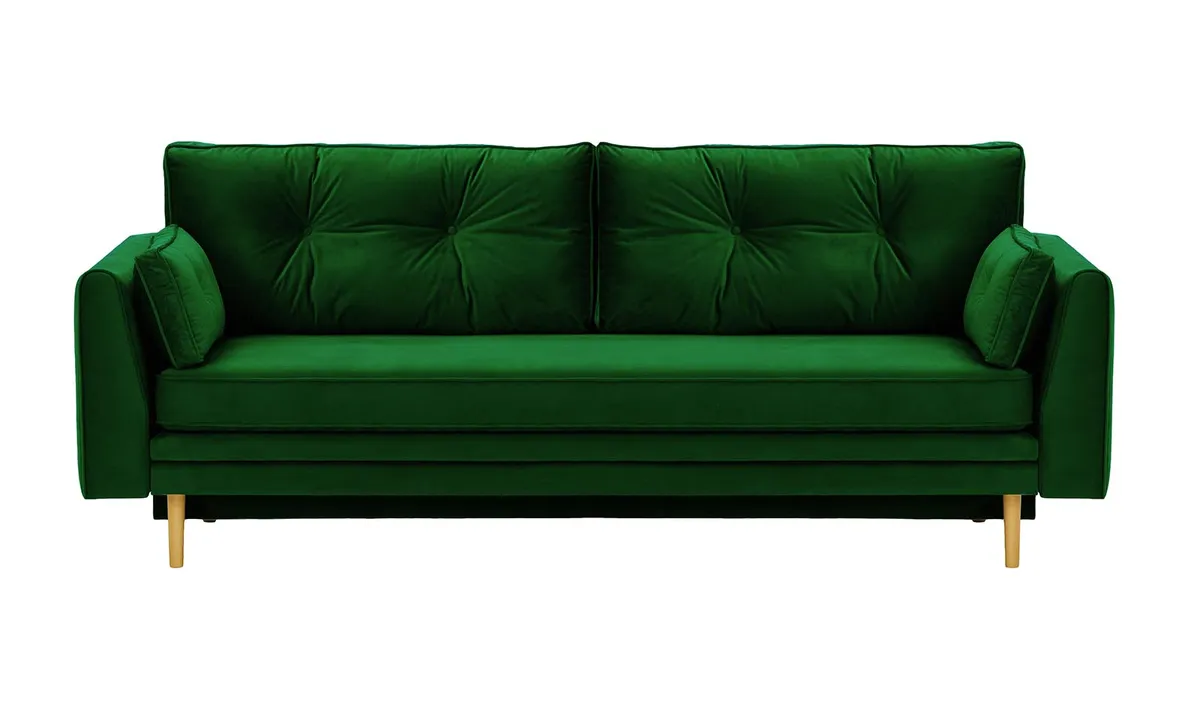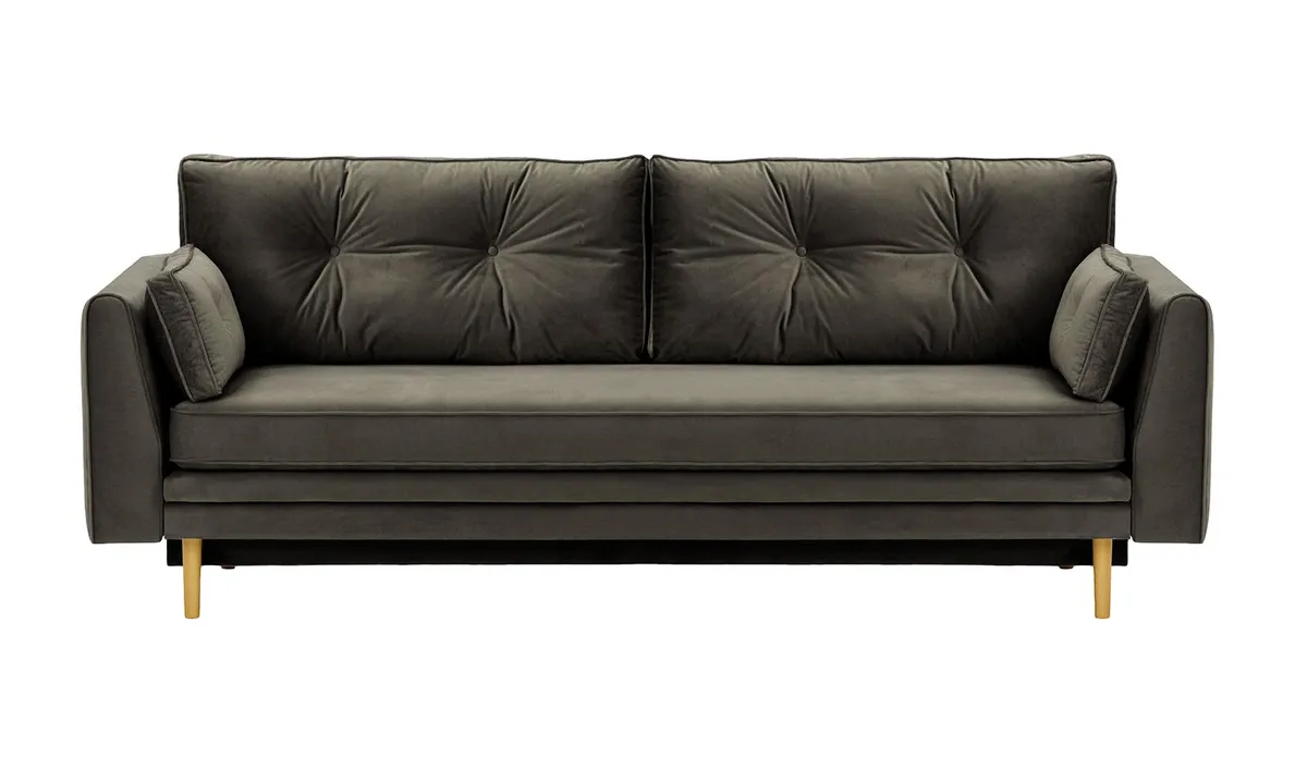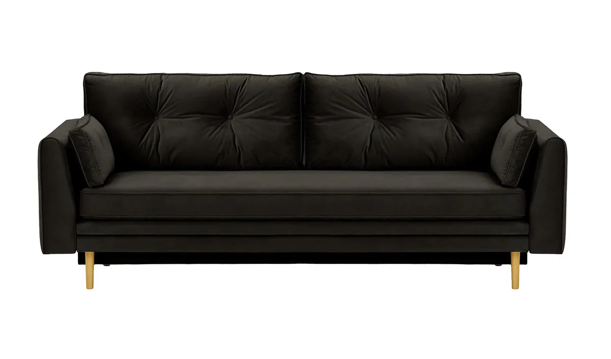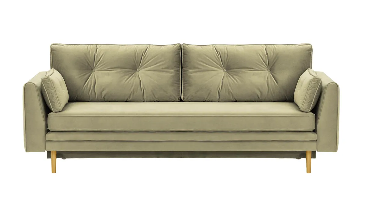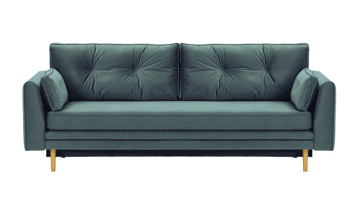 Model Magnus wyposażono w cichy i łatwy w obsłudze system rozkładania, który pozwala szybko przekształcić sofę w wygodne łóżko dla gości. Dodatkowym atutem jest praktyczny pojemnik na pościel – idealny do przechowywania koca, kołdry czy poduszek. Sofa unosi się na smukłych, drewnianych nogach, które nadają jej lekkości oraz ułatwiają przesuwanie i utrzymanie porządku pod meblem.
